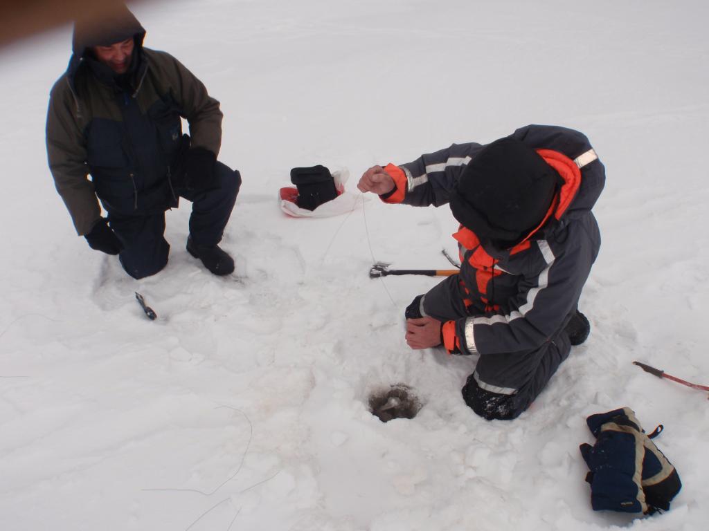 Говорит-рука замёрзла,давай ты. Я сунул руку,попробовал затащить в лунку-безнадёжно...пол головы только в лунке. Забагрили,разсверлили и ёёёёёпть.....