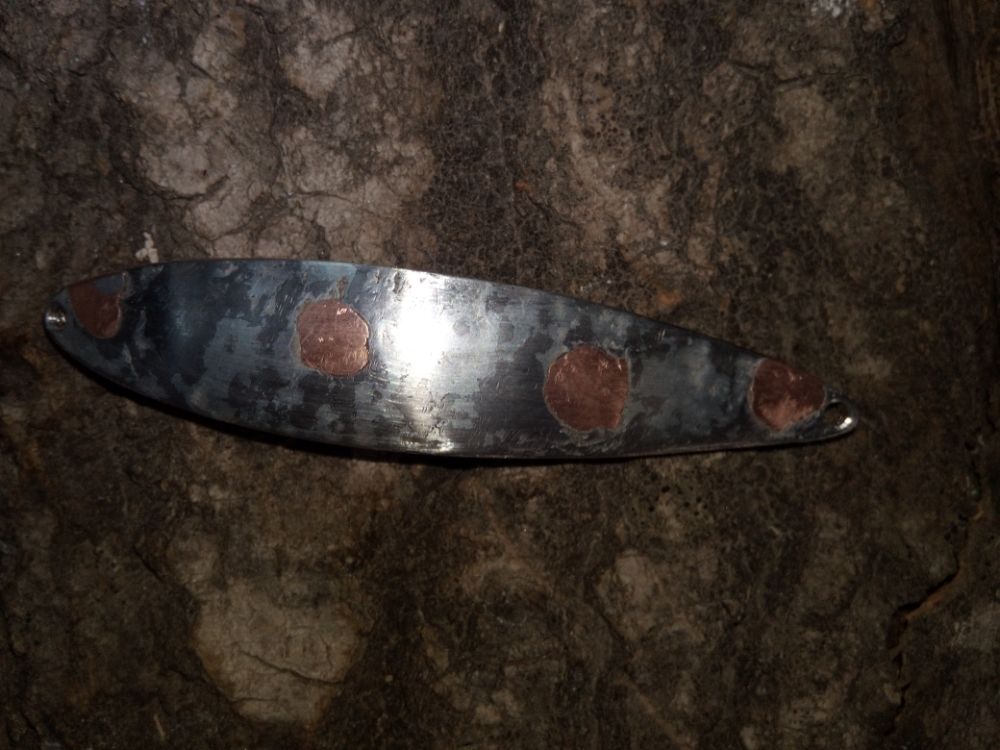 Добрый день. Попробовал сделать максимально дешевую колебалку из подручный средств. Собрал пакет: пластина латуни 0.4мм, три пластины оцинкованного профиля около 0.4 мм толщиной. Спаял (залудил всю поверхность, сжал двумя струбцинами между двух металлических пластин, нагрел на газу), закрепил самодельными заклепками из медной проволоки. Выглядит топорно, возможно из заводских заклепок вид будет лучше. Просто пайка при последующем выгибании разлетается. Обработал по форме, выгнул. Оцинкованную поверхность покрыл глиттером: фиолетовый обычный, полоски из желтого флуоресцентного. Длина блесны 68 мм. Поверх глиттера акриловый аэрозольный автолак два слоя.