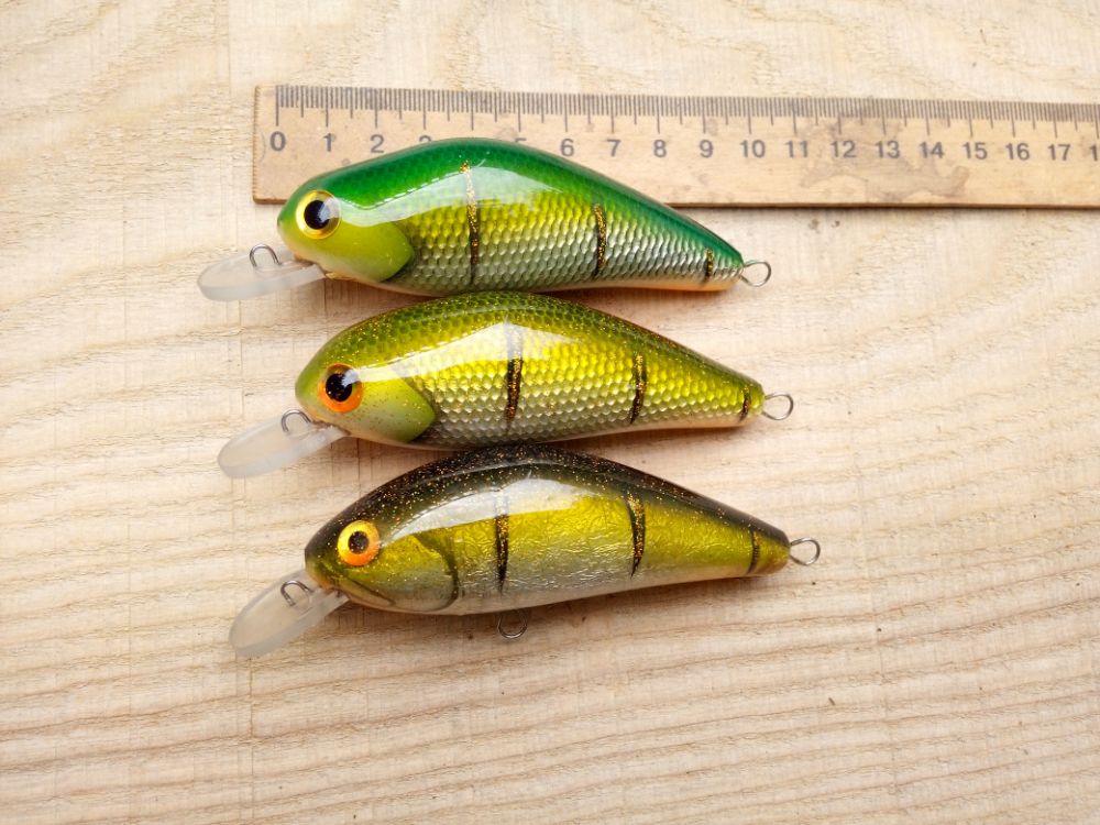 10cм, один сильно плавающий для заросших мелководий.Второй суспендер. Оба с погремушкой.