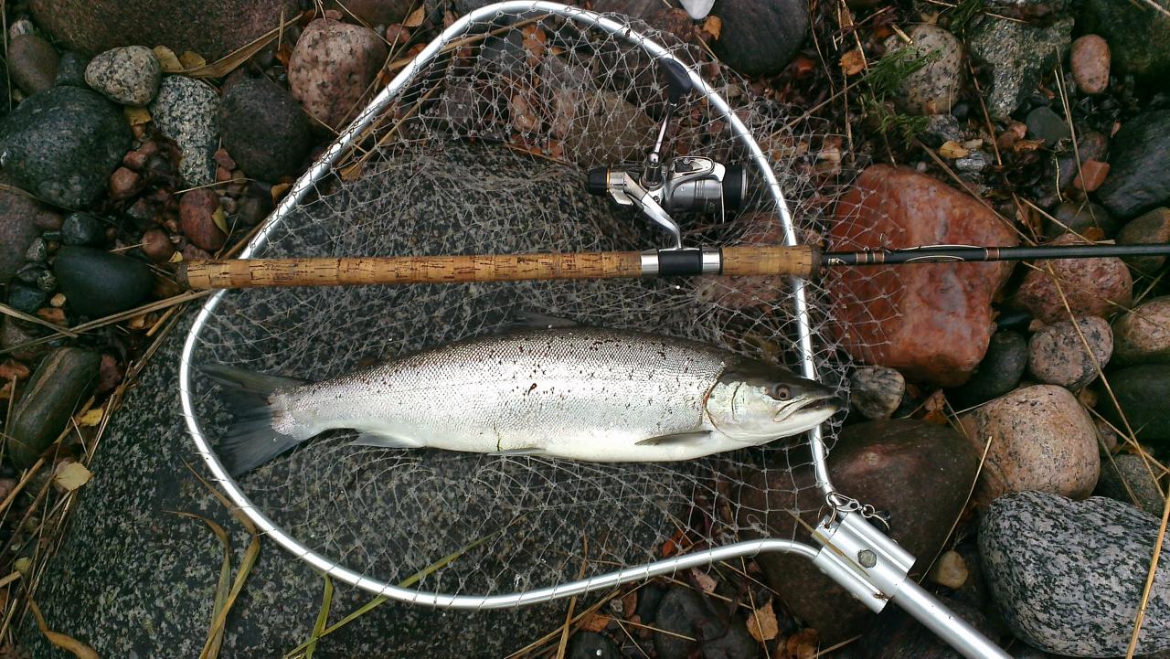 DAIWA полученная с ремонта (спасибо Гере Катрану) надежно сгибалась и отрабатывала рывки рыбы, полюбил я этот спиннинг, уж очень хорош в работе. Дальше все стандартно - место для вываживания - подарок: ни валунов, ни явных отмелей - плавный свал. Прыгаю с камня и после нескольких рывков приличия со стороны кумжи завожу ее над кольцом подсака. Есть!