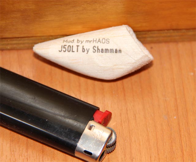 Заодно от скуки решил ЛУТ проверить на бальзе. взял одну схемку которая была распечатана на фотобумаге два года назад (!!!) вырезал кусочек с лого,взял несостоявшийся воблер , приложил бумагу, потер немного о утюг. совсем чуть чуть. лого отпечаталось на бальзе в легкую.