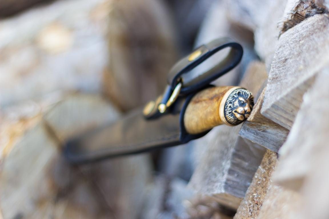 Ножны покупные, сделаны в Финляндии. Ручка покрыта не просто лаком, а пропитана Датским маслом и покрыта силиконовым шелаком, который делает покрытие не гладким, а как-бы резиновым на ощупь, то есть рука не скользить по рукоятке даже по мокрой, проверено