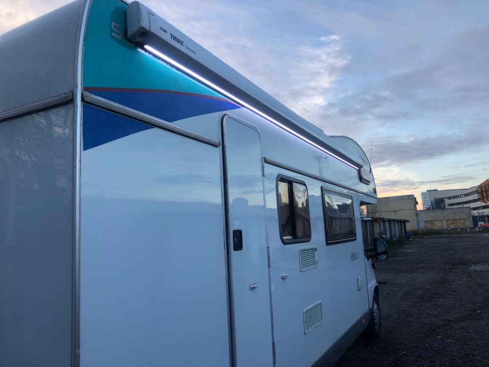 Заказал оригинальный профиль подсветки на маркизе, тем самым получил полное освещение борта во всю длину кемпера. Света теперь предостаточно!