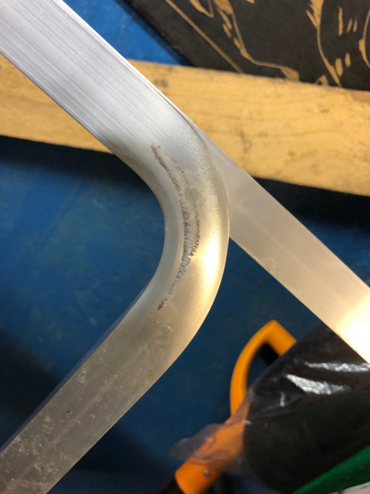 Приспособу собрал в гараже, обварил и закрепил на кирпичной стене. Далее сделал подробную разметку на профиле и начал гнуть. Первый загиб получился идеальным, но вот второй немного перетянул и радиус загиба сместился