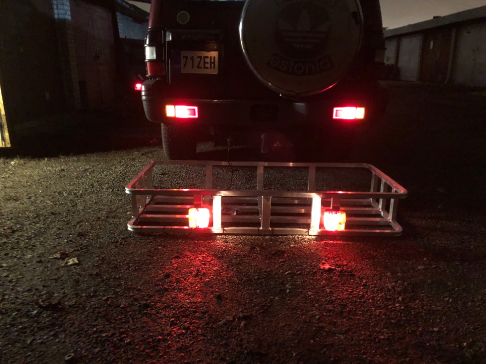 Ну тут Дима не подвёл и точно в срок я получил готовое изделие! Вес корзины ровно 10 кг, размер 1400х700х250мм Так как корзина перекрывает номер, пришлось заблаговременно заказать доп номер и повторители фар для его освещения. С этим проблем уже не возникло, номер и фары на месте, провод укорочен и уложен по профилю. Осталось дождаться саму собаку для определения оптимальных точек крепления строп и окончательного соединения с силовыми балками фаркопа.