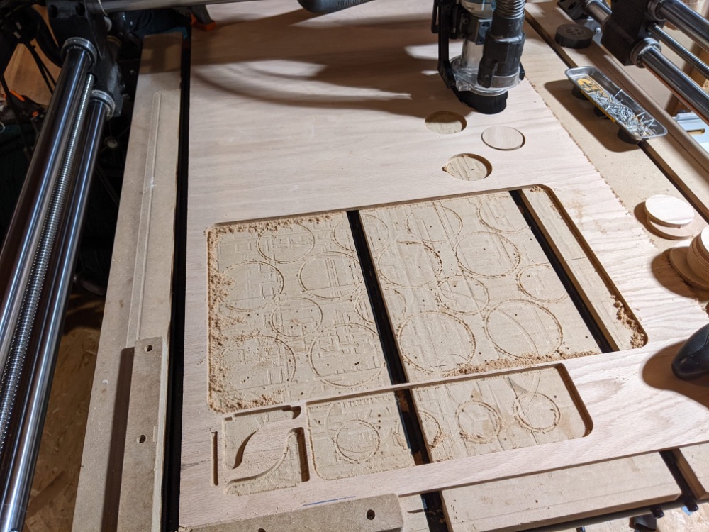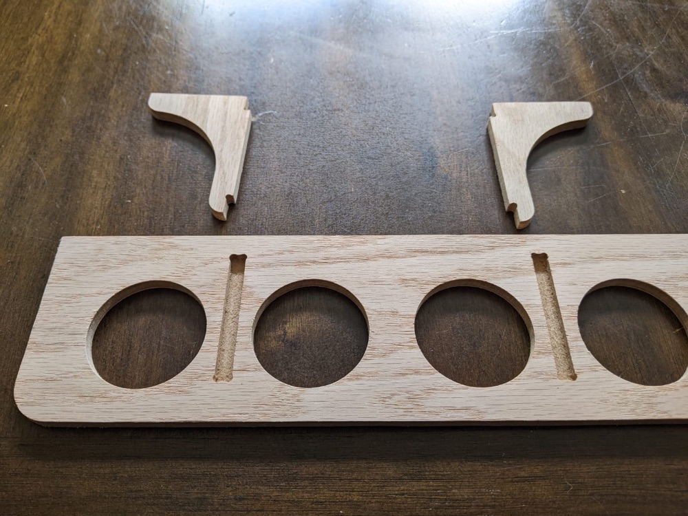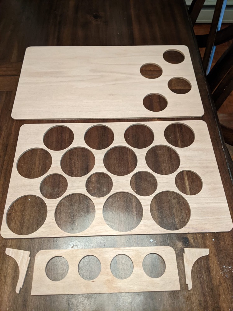При первой примерке всё разместилось компактно и все бокалы плотничком уместились в один шкаф. Но так далеко не уехать - всё попадает в первом же повороте. Пришлось поразмыслить над тем как их крепить. Оптимальным вариантом показалось изготовление органайзера в шкаф. В этом деле мне помог мой напарник из Канады, который занимается изготовлением всяких штук на CNC-станке. По материалу выбор пал на канадский дуб. Можно было и клён, но дуб крепче, а толщина листа всего 6мм. Замерив диаметр всех бокалов я сделал примерный шаблон, который переслал товарищу. Он сделал 3Д модель в Автокаде, закупил материал и нарезал мне органайзеры.