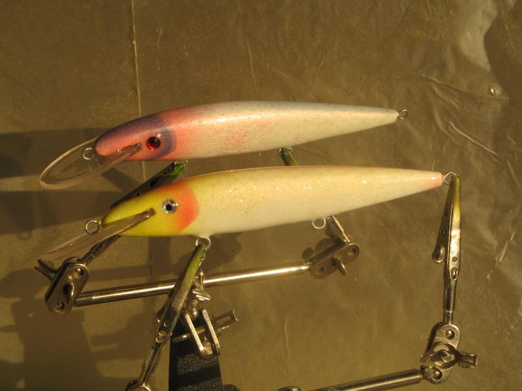 Точки секрет(без обид ,дал слово жене не рассказывать), а полосы трафарет по фотке из журнала(фото кеты). Нравится мне этот вобчик ,жаль ,что фото не может передать ,вживую интереснее.Спинка покрывается перламутром по чёрному и получается фиолет -хамелеон . Когда друзьям показываю прикольно на их глаза смотреть ! Жаль только что многие поймают по одной рыбке и в коллекцию на полку, говорят ,что жалко если оторвётся. А хочется сделать" народный воблер" -" фолькс -ваблер"