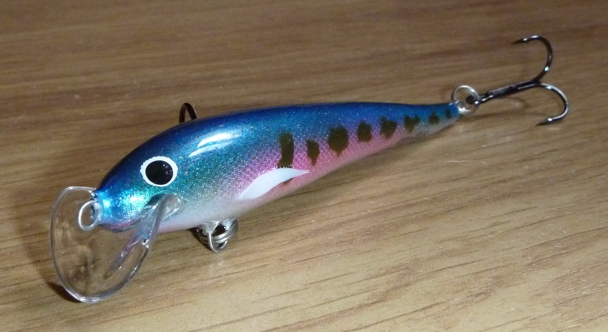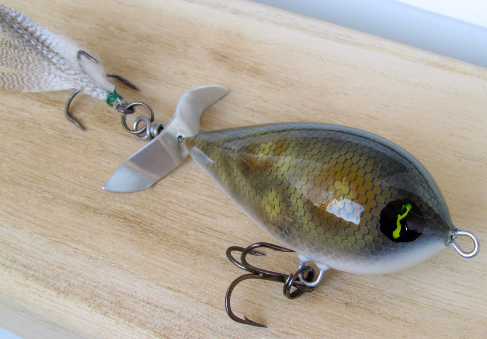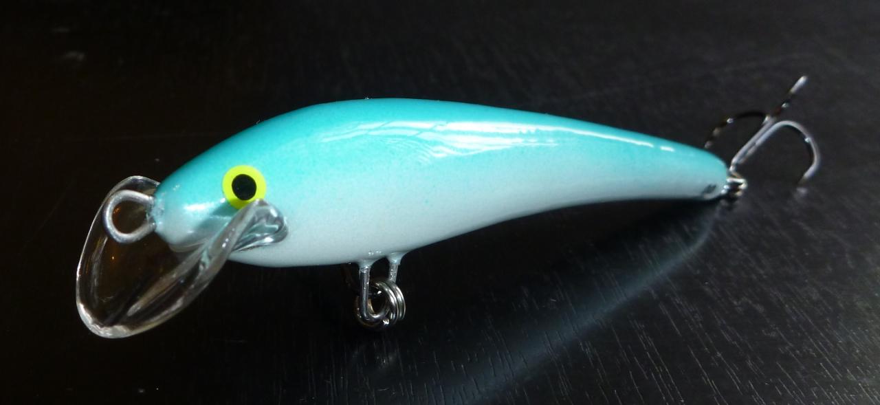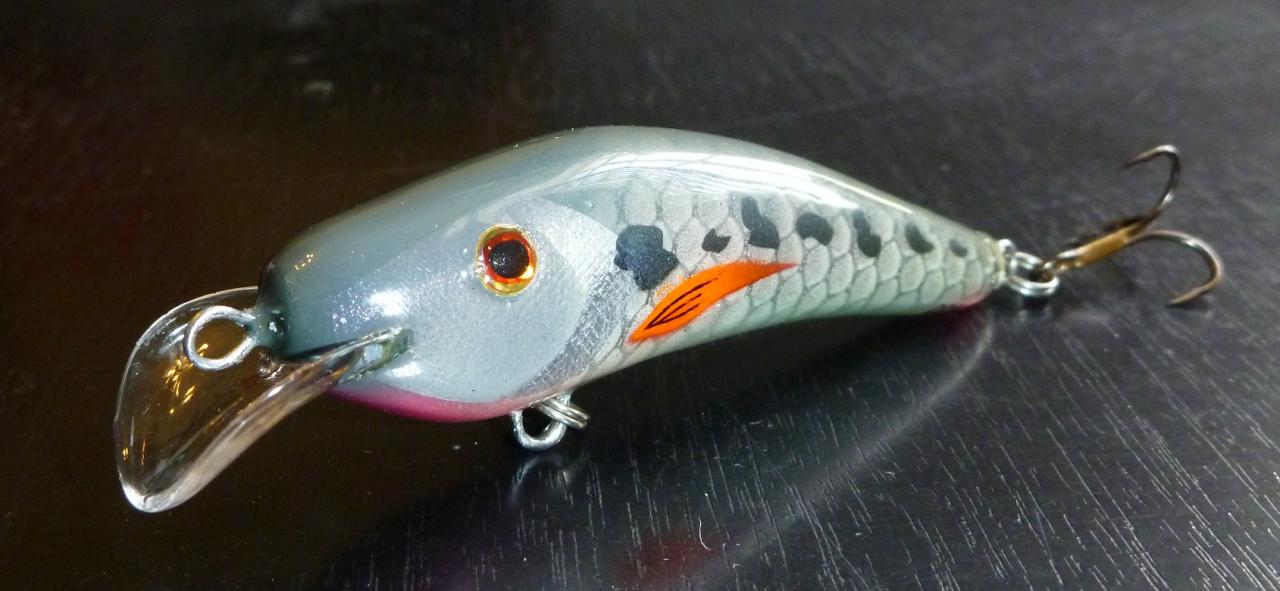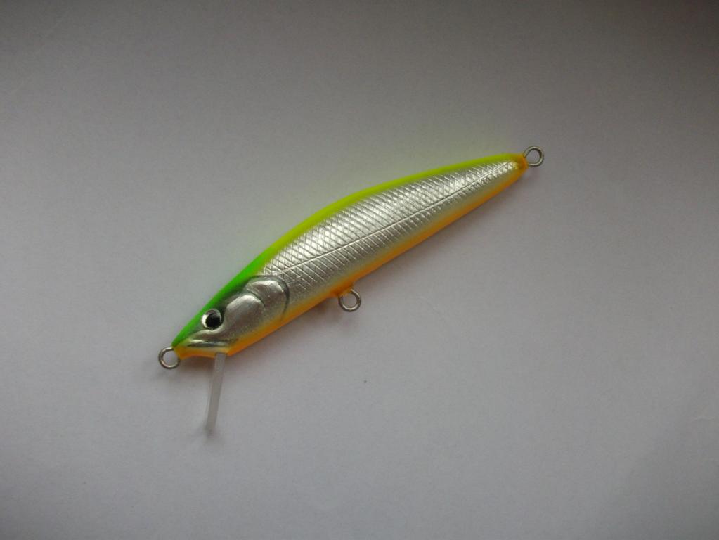 6. Спасение от каверн - лакировка. Лак акриловый глянцевый "Сонет". Можно и матовый "Сонет" - тоже работает. Можно покрывать аэрографом с большим соплом вблизи, чтоб лак сох НА ВОБЛЕРЕ, а не в воздухе. Но намного проще кисточкой. Внимание! Каверны и здесь норовят проявиться, но аккуратность и несколько проходов кистью все решают. Стремиться к идеальной поверхности бессмысленно. Не получится, да и незачем - сэр Энви потом решит проблемы мелких полос лака... Один тонкий слой кладем.