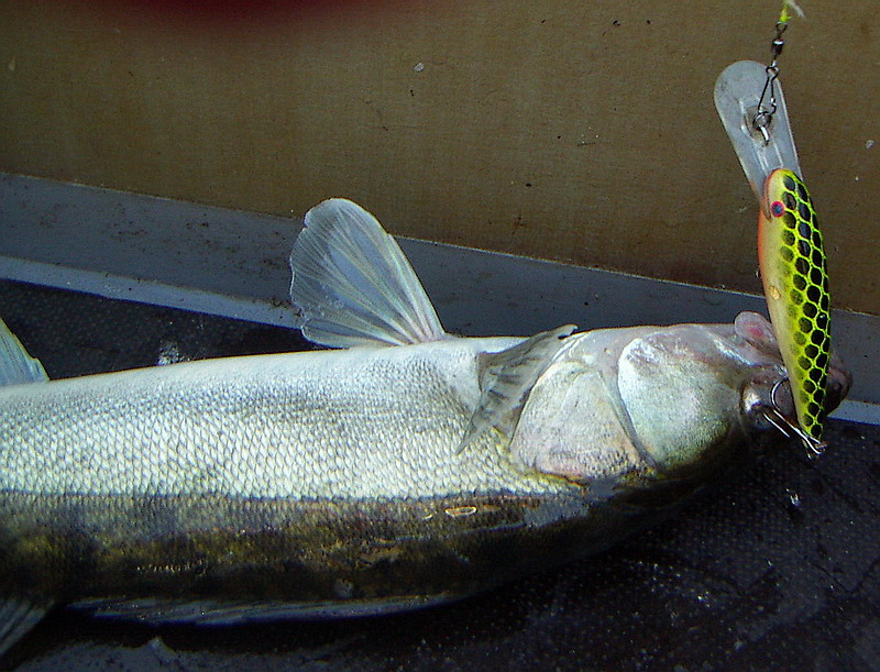 Рыбалка была несколько трудовой - с эпизодическими раздачами на конкретных точках нафигатора по свалам глубин. Рыпп снова охотился на стайную рыпку длиной со спичку и относился к приманкам очень избирательно. В основном вся рыбалка у меня состоялась на два одинаковых шумящих шада-8, с расцветкой "леопард" . Причём, попытки применения аналогичных - бывалых шадов с чуть другими расцветками результатов практически не приносили!