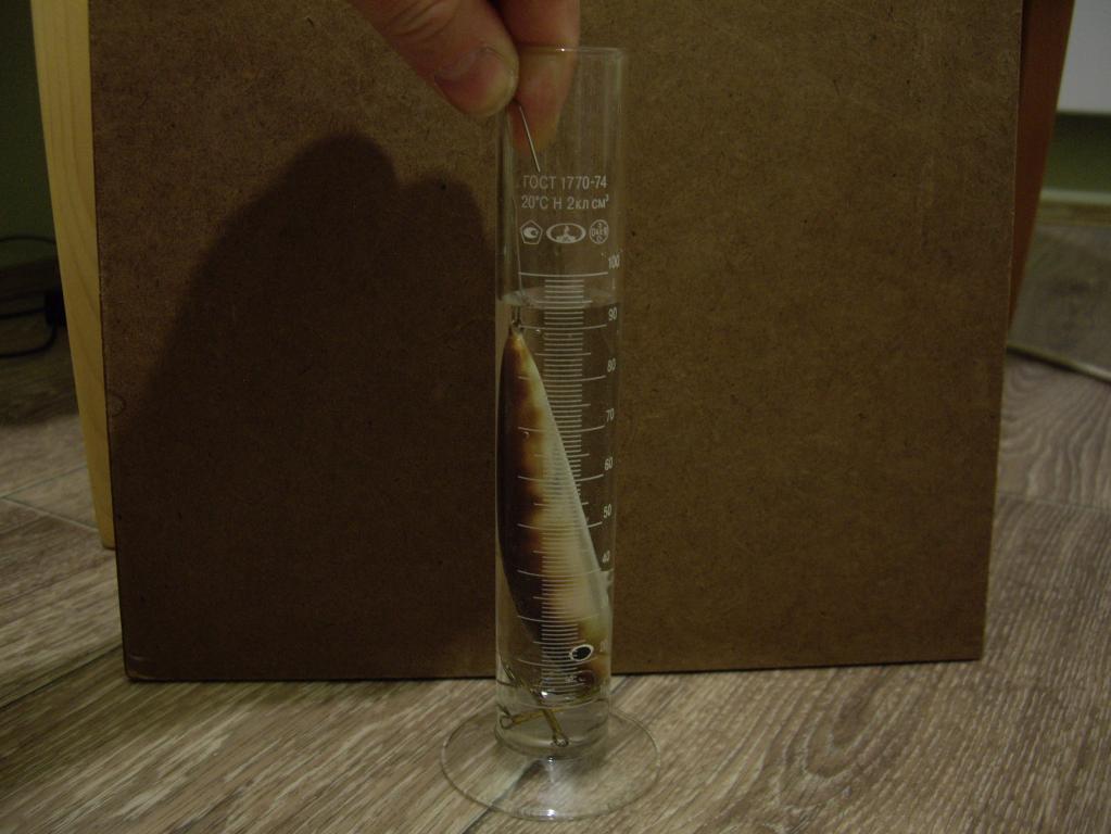 Итак,после пропитки(или на какой-то другой фазе изготовления-это кто как делает)берём заготовку и погружаем её в этот цилиндр с водой,туда же кидаем тройники и лопасть(они тоже имеют какой-то объём) и смотрим по делениям на сколько поднялась вода.Правда не учитывается ещё объём лака и точность измерения тем меньше,чем мельче воблер,но приблизительно посчитать огрузку для суспендера можно.А для плавающих или тонущих уже прибавляй или отнимай от полученного результата.Вот как-то так...