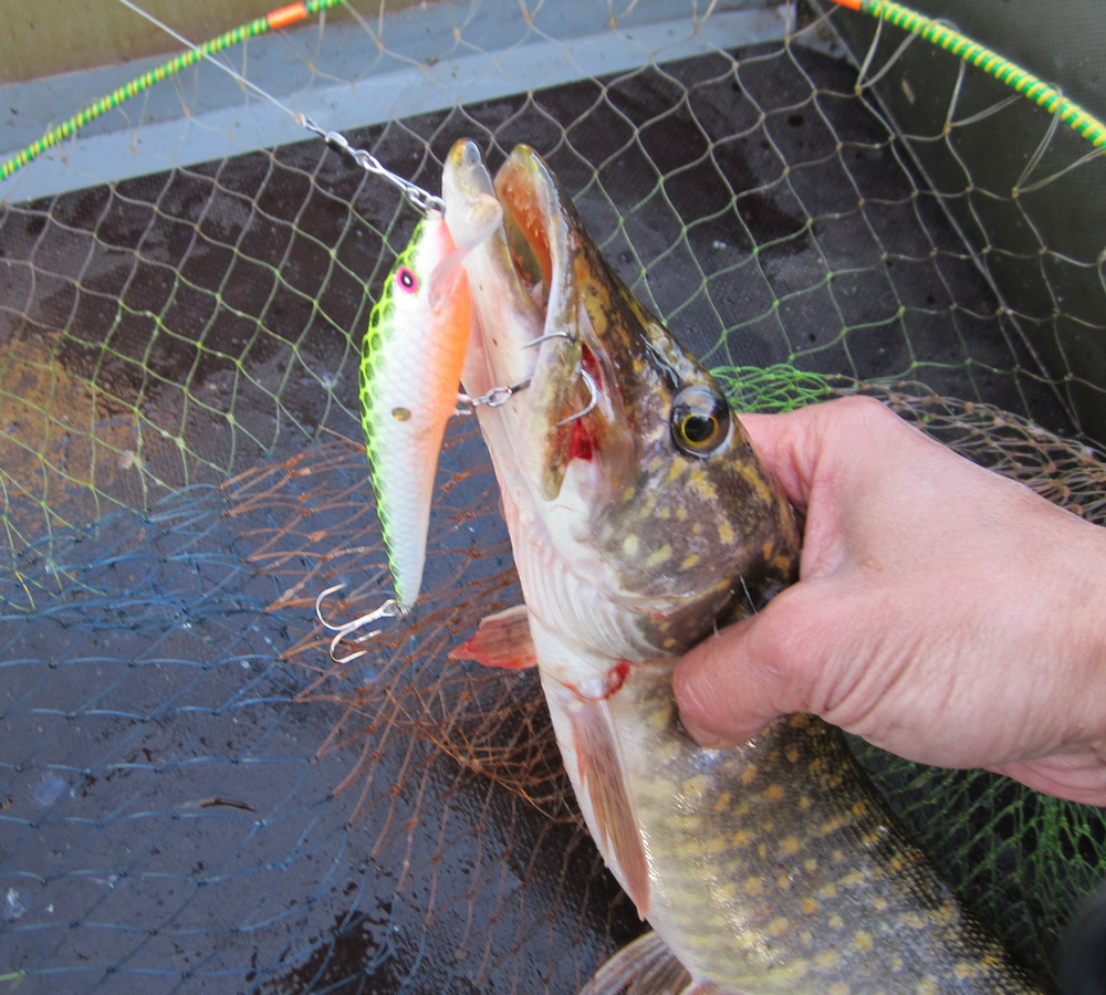 Пока поддувал небольшой ветерок и по небу шли облака она худо бедно подгибала. Однако когда наступил полный штиль и гладь озера стала похожей на зеркала щука ушла в полный игнор. Ловил сугубо на свежий "онежский корм", который вчера ещё подсыхал на отвесе после лакировки. Немного сработала окраска с элементами чёрного цвета. "Тигра" вне конкуренции"!