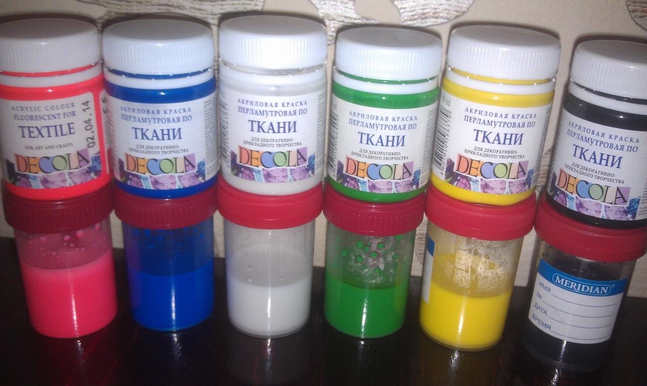 Купил краску деколу для пробы пера. Вся краска для ткани с перламутром кроме красного флюрика. Разводил краску раствором который тут не однократно писали, вода + водка + мистер мускул.