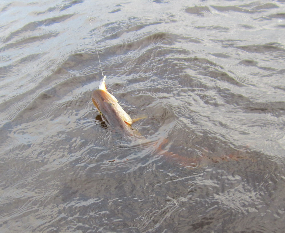 В конце концов стихия победила и плюнув на такую рыбалку пошёл я к берегу. Однако не всё так плохо как сперва представлялось, т.к. по пути к машине попал на микро раздачу. На этот раз вдруг выстрелил "чёрный пенопласт"! Целых три хвоста на один и тот-же воблер это уже не случайность.