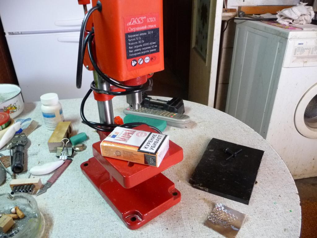 Собственно,давил впервой,тоже сноровка нужна.Кстати,канавку для гильз фрезернул на этом же станке шарошкой.Придумать бы ещё фиксатор для глубины сверления.Трудновато выдерживать горизонталь.До кучи:размеры станка указывал,а для визуального ощущения:.Станок по шуму-Эл.бритва громче в разы.Визжит,только когда фрезу втыкаю.