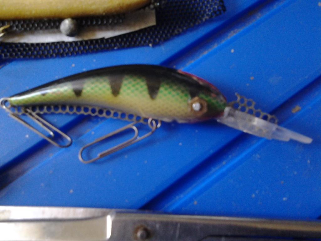 Для "красных висюлек" тоже подбираю место.А вот основной/стационарный/ огруз не должен быть болтающимся, поэтому место под него ищу при помощи зажимных поплавочных, свинцовых оливок разного веса. Воблер /пробник/ был сделан ещё в 90 годах, такие были сделаны и с другими лопостями,по ним я учился понимать игру . Но на сегодня пользуюсь другим методом. Обрисовываем контур низа живота на бум. скотч ,вырезаем его и наклеиваем на металл. сетку, моя толщиной в 0,7мм. Вырезаем ножницами нужную по дл. ,шир., и конфигурации пластинку вместе с наложенным скотчем,тоже самое в носовой части /отдельную пластинку/ оставляя место под прорезь лопости и делаем временную вклейку в прорезь живота и носа.Вклеенная часть со скотчем потом легко удалится. Дальше после высыхания обрезаем наружную часть скотча ножом и отлипляем его с пластины. Вклеиваем в прорезь лопость под нужным углом /я делаю её немного свободной , чтобы после вклейки можно было её подрегулировать, лучше применять гель/ Отстраиваем ровную. стабильную игру при минимальной огрузке /вешаю скрепки, иногда достаточно и самого сеточного каркаса/ так он будет более отцентрованным.Ошибка -обязательно вешайте груз на петли предворительно их выровнев /пластину/ иначе в последствии могут быть завалы на готовом. Место под крючки лучше искать при помощи основных крючков подвешивая их на мягкой или слабенькой пруж. проволоки /подбираем колич. нижн. крючков./ Потом колдуем с свинцовыми зажимками в разных точках поджимая их, на рефлённой поверхности сетки они плотно держатся. В последствии их можно использовать /сплюснув/ в качестве основного груза , что бы не прибегать к изготовления свинц. пластин такого же веса.Можно под них расширить или просверлить паз в дальнейшем закрепить на основном каркасе и залить эпо. Важный момент- всё выше описанное лучше делать после 4-5 окунаний в лак , особенно если воб. фольгированный т.к. меняется его обьём и вес. Опускать в лак следует когда каркас ещё под скотчем и отверстия закрыты. В данном случае может быть будет достаточного лака вместо геля для удержания каркаса, давно хотел это попробовать ... Вообще методов такой отстройки можно придумать много. Ну и носовую петлю выбираем уже исходя из того .что мы хотим от воба. Можа я чего и пропустил , но примерно так... Конечно ради одного ,двух вобов такую работу может и не следует делать-кому как.Фото сделал на скорую руку для наглядности. Извиняюсь , сразу не посмотрел ,носовую пластину плохо видно, она в форме носа с 5-ю отв. После такого описания уже нет сил что-то переделывать.Ikel писал(а):vedmak Можно фото по чётче? Тема интересная. Что в качестве подвесных грузиков используется? Те красные висюльки?