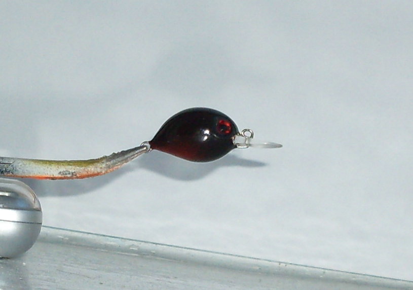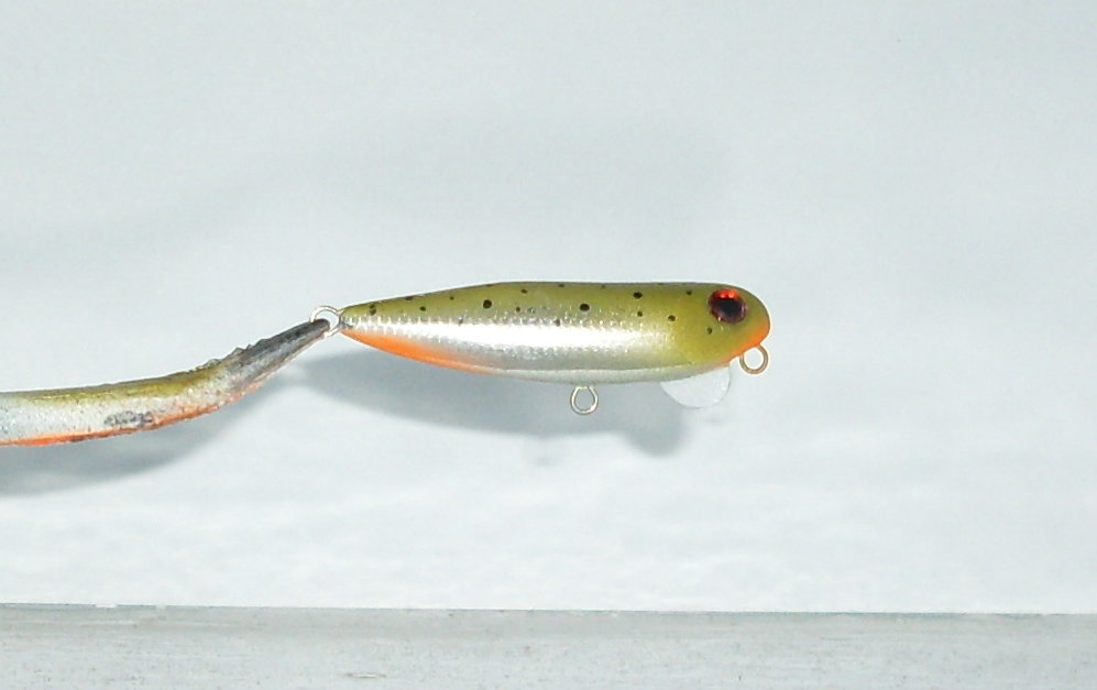 Делал для проводки против течения , язычок не большой , игра мелкая . Очень хорошо себя показал , за что был искусан щуками и помят голавлями , обсосан окунями и даже продегустирован жерешком . За это , после ремонта , награжден американскими глазками .