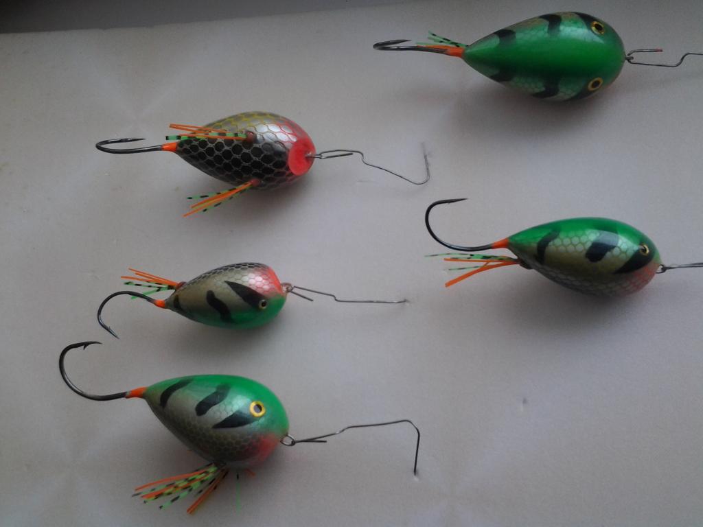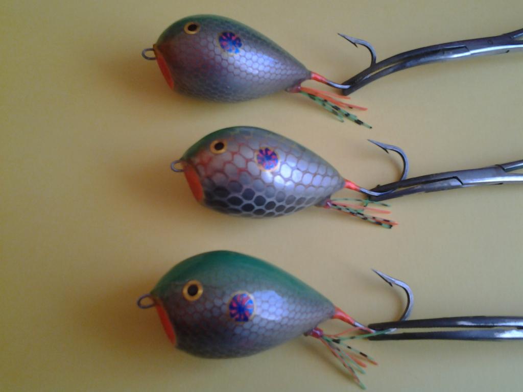 . Да и все знакомые на них помешались.Но ловля на них честно говоря оч. азартна и захватывающи. Вот выкладываю свои работы, снизу специально делал чешуйки чёрными - для контраста на фоне неба:- крупные яйца абашка дл. 8см. вес 20 гр. , мелкие бальса 5.5 см. вес 14 гр. Огрузку для больших и малых отливал разную и в разных местах устанавливал. На больших 6 гр. типа полуолифки приклееной снизу , на малых 4 гр. типа конуса с расширением к носу вставлял на 1/5 тела снизу в спец. высверленное конусное отверстие. Второй вариант понравился больше, не только мне , но и щуке. .