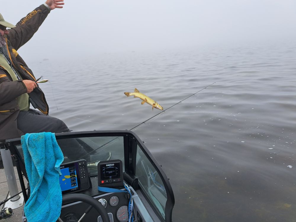 решили смещаться. А тут и туман опустился. Но рыбка клювает. Но размер пока не тот. Ставлю слайдера 10-ку в красном цвете.( он кстати и сделал практически всю рыбалку) Мелочь бодает, но не садится.. Через какое то время стали садиться и вкусные размеры. В итоге расклевалось так, что ой-ой-ой. Менял приманки, всё одно клюёт. Тёзка какого то бурбулятора разловил, приколный воблер. Бубулькает прям музыкально.