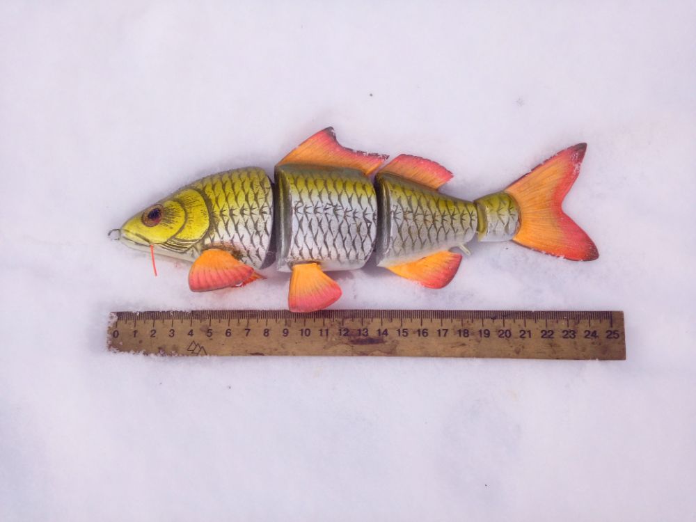 Добрый день. Результат воплощения еще одной идеи. Хотелось бы создать деревянную "силиконку". пока полученные результаты далеки от желаемого. Игра хвоста получилась слабая, скорее всего влияет вариант сборки на двух нитках. Все таки у силиконки хвост играет не из стороны в сторону, а как бы скручивается, при данном варианте сборки скручиваение сильно ограничено. В дальнейшей работе попробую собрать на одной нитке. Огрузку делал ближе к носу, для наклонного положения в воде, но не учел плавающий хвост, который "опрокидывает" приманку почти до вертикального положения. Думаю, что оптимальное расположение огрузки в районе плавников. Также для получения большей стабильности огрузку попробую располагать ниже (в этой приблизительно 5мм от нижнего контура).