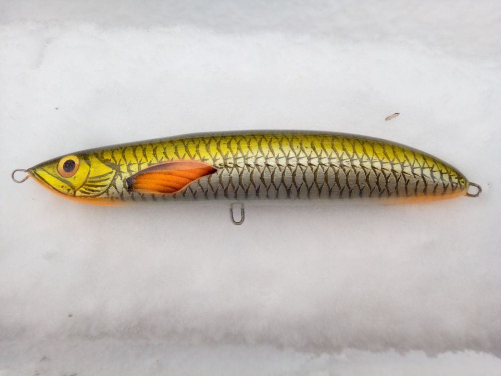 Добрый день. Неожиданная находка 2020го года. Просто чтобы сделать что-то новое решил пополнить арсенал приманкой в японском стиле. За основу взял работу японца и американца. В результате получилась неожиданно очень рабочая лошадка. Поскольку Финляндию закрыли, то отпуск проводил на малых речках. За две недели рыбалки пять достоверных поклевок: две поймано, один достоверный сход - рыба в пределах видимости, две визуально видимые атаки. Четыре из пяти принесла эта конструкция. К какому классу ее отнести пока не знаю. На фото длина 12см.