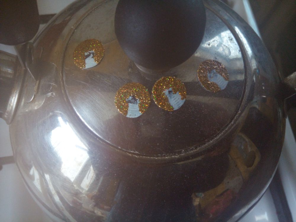 Распечатка глаз на бумаге, кому как нравится. Коректором наношу белый слой, чтобы не промокало лаком и созадать белую подложку. По краю энвиротекс, глиттер, на грячий чайник для быстрого высыхания. Зона, за которую держал зажимом потом обработана красным голографическим глиттером. Поверх нижний край покрасил тонким слоем прозрачнго оранжевого. Тонкий слой лака.