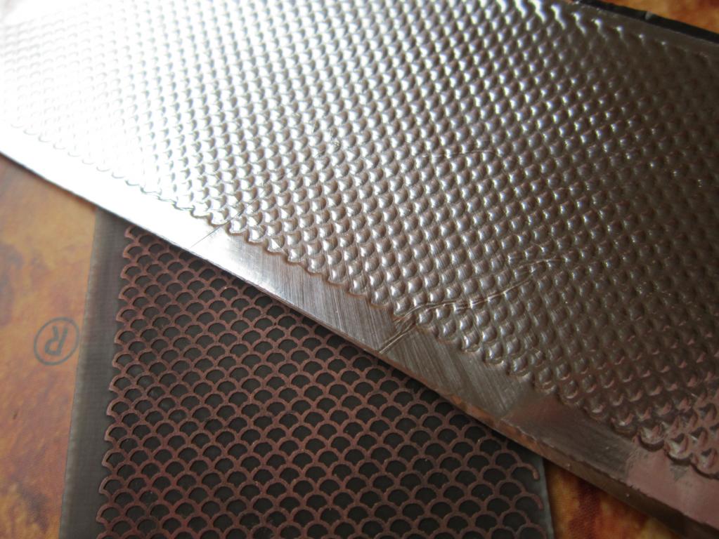 глубина чешуи 0,2мм размер3,5мм накатка протиранием на клише ученической резинкой для стирания мягкой рисунок передается один в один за минусом толщины фольги