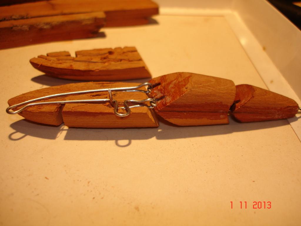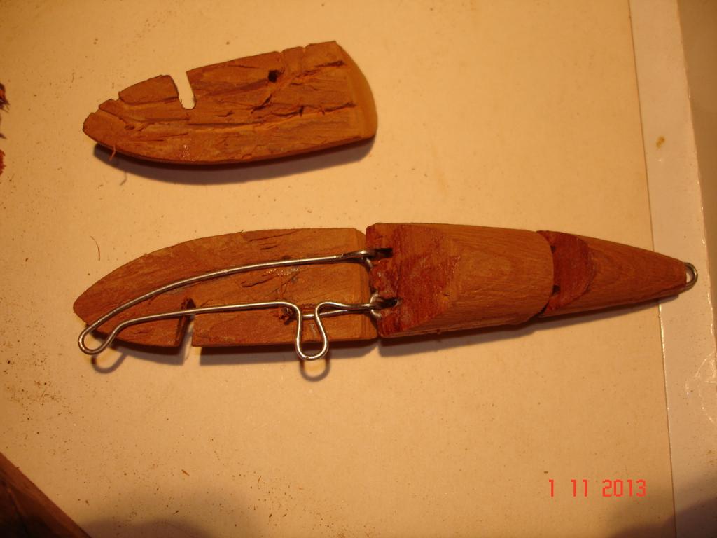 Трехсоставничек, материал- все та же кора, размер 9,5 см, подповерхносник, сделан оперативно, на скорую руку в течении одного дня для рыбалки на следующий день, поскольку ловля была на сильно зарошшем мелководье, разловлен сразу же. Покрыт быстросохнущей автомобильной эпоксидкой, которая продается в спаренных шпритцах. Плюс в том, что покрывается довольно толстым слоем, твердеет быстро, в течении получаса уже можно держать в руках, твердая, но при длительном контакте с водой проявляется ее минус, начинает мякнуть. При последующем высыхании, как правило, в коробке - опять затвердевает. Подумываю смешать ее с обычной эпоксидкой, интересно какой будет результат :scratch: . Иногда очень нужна смесь со средним результатом затвердевания по времени, попробую - отпишусь.