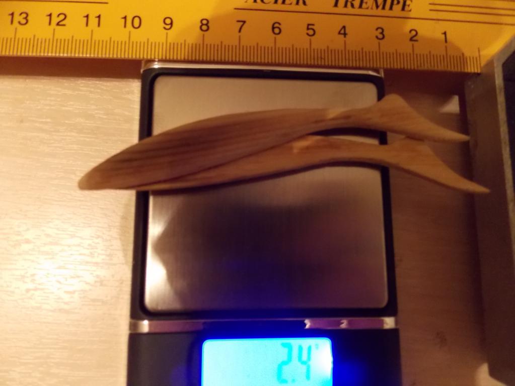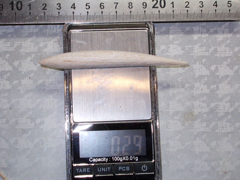 Сразу появилась куча вопросов , но попорядку. Многие наверное помнят , что я собирался делать форму хвостовиков, и собирался сделать с более плотного материала. Решил сделать с елового бруска /всяк будет потвёрже пород принятых за основу/ выточил две /временно/ склеенных половинки кинул на весы- 2,8 гр. Чтобы расклеить две половинки надо было разогреть клей, сунул в микроволновку и чуть передержал. для интереса кинул на весы-2,4гр. И появились такие мысли - сколько бы весила такая заготовка /10 см./ из бальсы , абаши, осины , липы ?