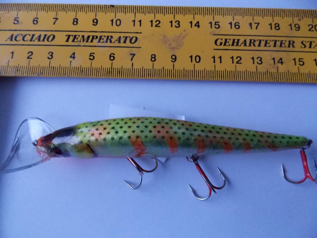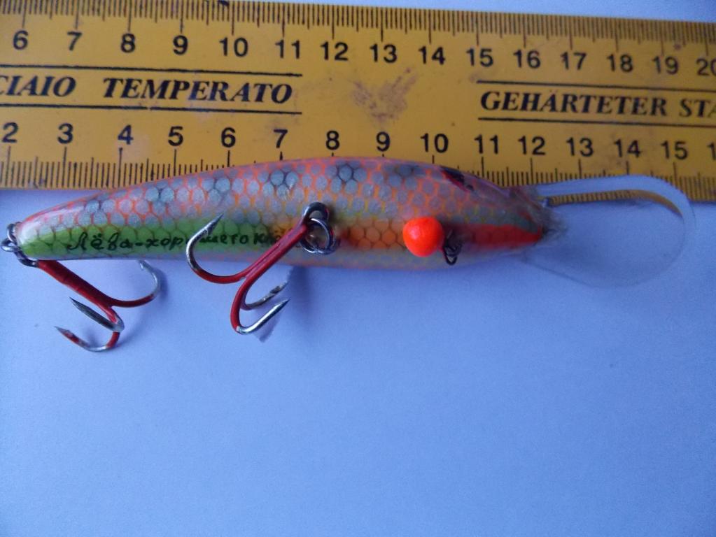 Пластик вес 6 гр. тонущий шумовой. Две фотки спины -я хотел показать красивый переход чешуи с зелёного на синий /хамелион/ но под лампой удалось плохо, ужо вечер.Красная боковая линия была предварительно перед маканием покрыта прозрачной пастой 3D с блёсками. Лопость самодельная, поэтому наверное многим будет интересно посмотреть на игру. Выложу ролик сегодня если батарейки выдержат ежели нет то завтра.