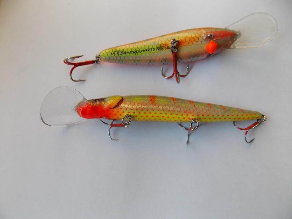 Верхний-бальса плавающий огружен перед и за центр. петлёй. Вес-12гр. Нижний -тонущий, пластик с 2-я шариками стац. огрузки и 2-я шариками перекатистой огрузки с носовой части к хвостовой /погремуха/ вес 17 гр. Сколько наложено трафаретов и красок