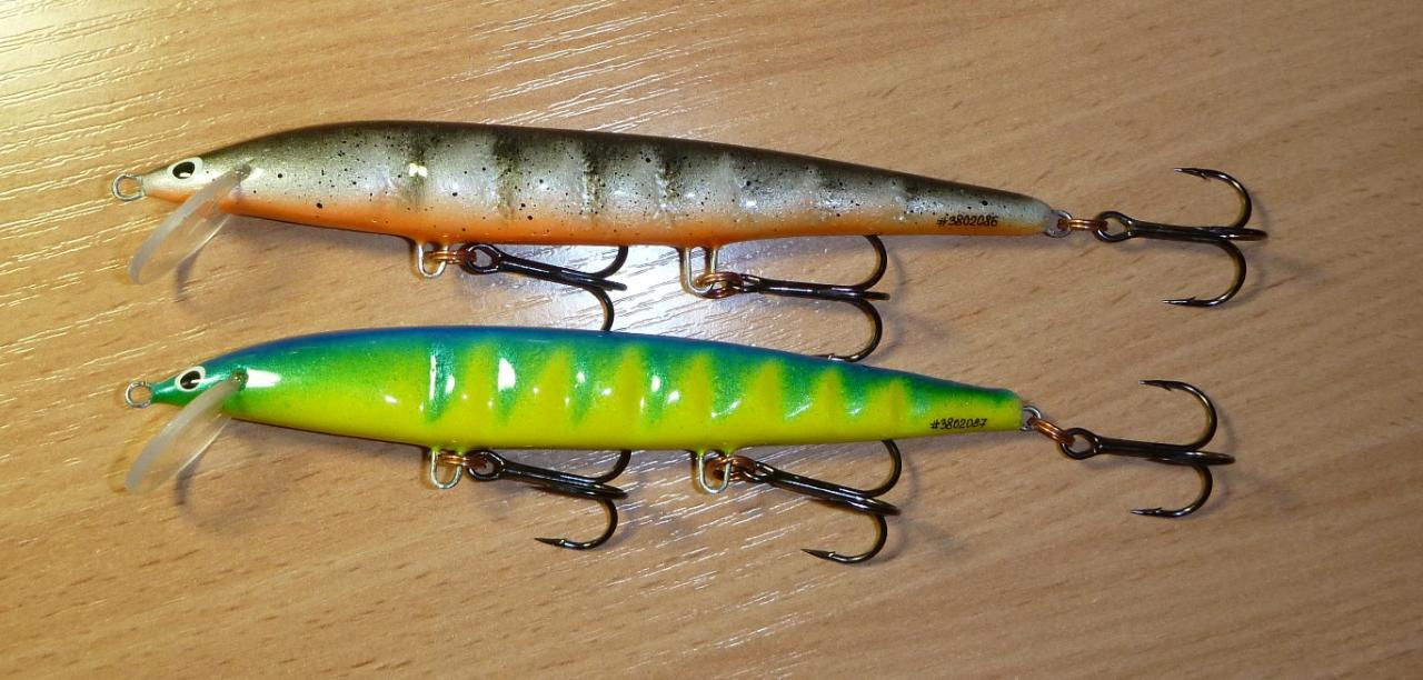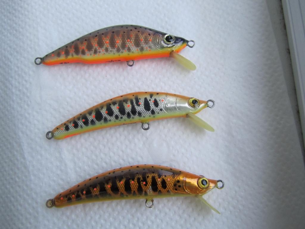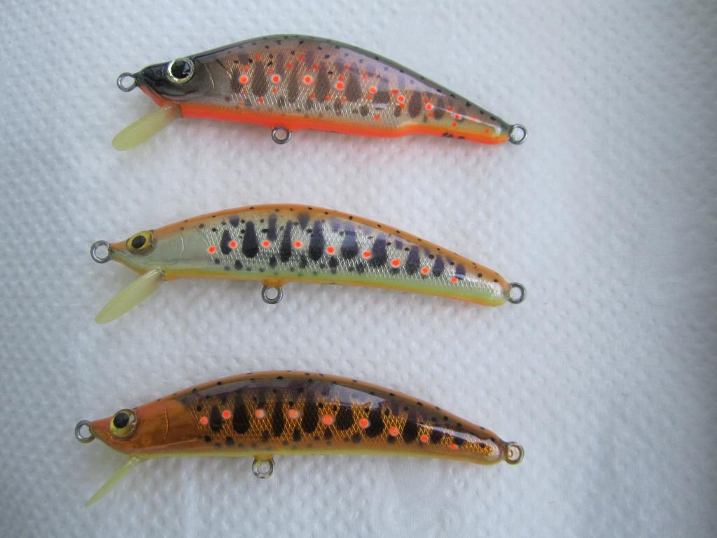 глубиннички дл.5.5. см. вес 5 гр. игру нашёл оптимальную по заглублению и мелкочастотной игре поэтому лопость почти в горизонте. пришлось для лучшего старта немного её утяжелить и отцентровать шариком. Для бросковых воблеров важно чтобы игра шла с старта иначе теряется место заброса.
