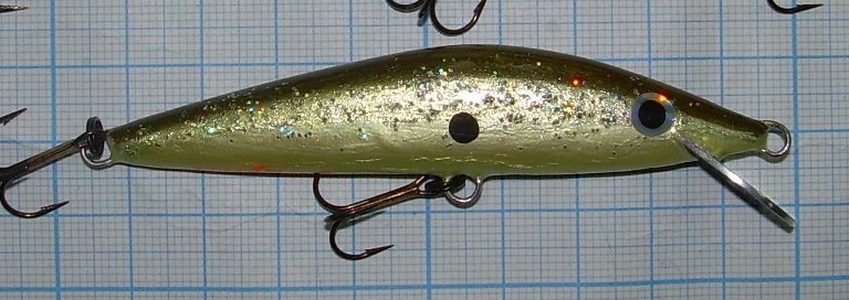 Форма тела рыбки не способствует нормальной игре- скорее излишней стабилизации; легкий верх, очень тяжелый низ, вертикально стоящий корпус, излишне большой горб на спине дальше средины и самое основное высокостоящая буксирная петля, да и заднюю надо ниже - супер стабильный проект - как подводная лодка.PavelKo писал(а):Господа- товарищи, помогите, первый блин комом. Игра какая-либо отсутствует, огружал до и за средней петлей, лопатка такая, пробовал еще круглую, носовую петельку пробовал отгибать- не помогло, в чем может быть дело?