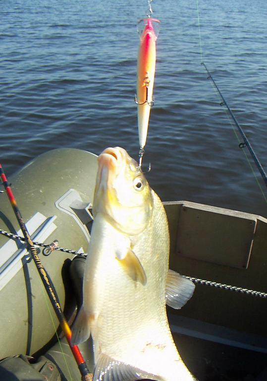 хватка среднего тройничка - два крючка в губе - все же это настоящая хватка , я удивлен ,слышал ловят лещей спинингом на маленкие двухсантиметровые калебалочки , но на такой большой воблер........