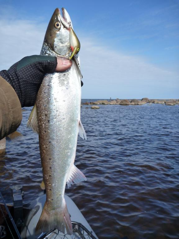 Фоток больше нет. Когда фотографировал - налетел на на камни и чуть не перевернулся. Да и сильная она - всё норовила из руки выскользнуть - фотаться не хотела... А по подробнее : С утра почти штиль. Мы в лодку и давай дорожить. Дорожили час - ни загиба ни поклёвки. Пошли на дальний кордон, к камням - покидать. Покидали - опять ничего... Опять начали дорожить. Тем временем поднялся СВ - 3-4 м/с. На вобики начала цепляться тина какая то, или трава прошлогодняя... Решили дорожку свернуть. Давай опять бросаться, на речку сходили, каждый камешек обошли - ничего, только бакланы, нырки и лебеди и морем пахнет. А на закуску оставили проверенное место Алексея. До него добрели и опять давай в заброс ловить. Тут то мне и попёрло....