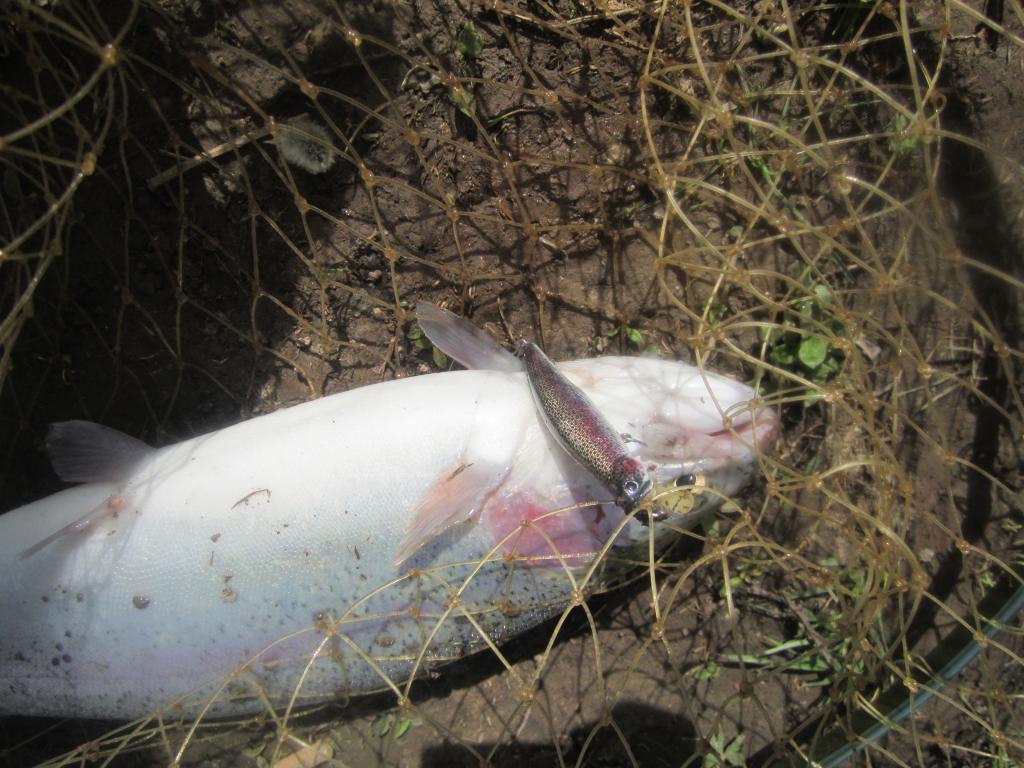 29.04 2012 ловил на платном водоёме у себя недалеко в Новосёлках (Подмосковье).Водоём достаточно большой ,запруженная речка со слабым течением.Ловля в заброс .Активность рыбы слабая.Даю разловить "свой воблер" моему другу.Как всегда ,уже стало традицией,на втором забросе вот такая долгожданная.Примечательно ,что из всей кучи перебранных воблеров(заводских) сработали старые проверенные солдаты и расцветки.Ловим, как обычно, спустя неделю после запуска.Рыба успевет одичать за это время и естественного корма в избытке развелось(верховка в огромном изобилии видимо из-за оставляемого прикорма).На спиннинг удаётся поймать далеко не каждому,без преувеличений,все ловят в основном на пасту или на креветку.В общем очень рад остался сделанным предпочтением рыбы в тот день.Третий год ловим периодически на этом водоёме,но рыбалки всегда трудовые 12-ти часовые,как сверх-марафон.Максимальный улов 7 штук у моего друга,у меня всегда заметно скромнее(проигрываю постоянно).Один раз как то уехал с нулём.Одна вымученная -- частый результат .