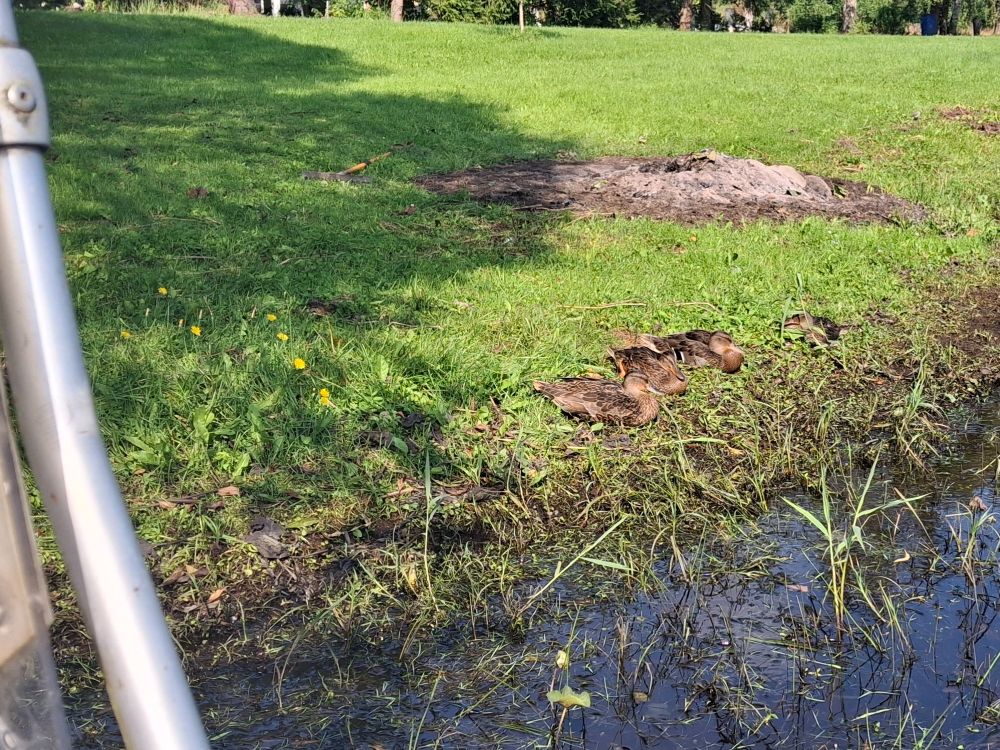 То лебеди сидели около лодки , теперь утки подросли , и место облюбовали , подходишь на лодке к причала, они и ухом не ведут .
