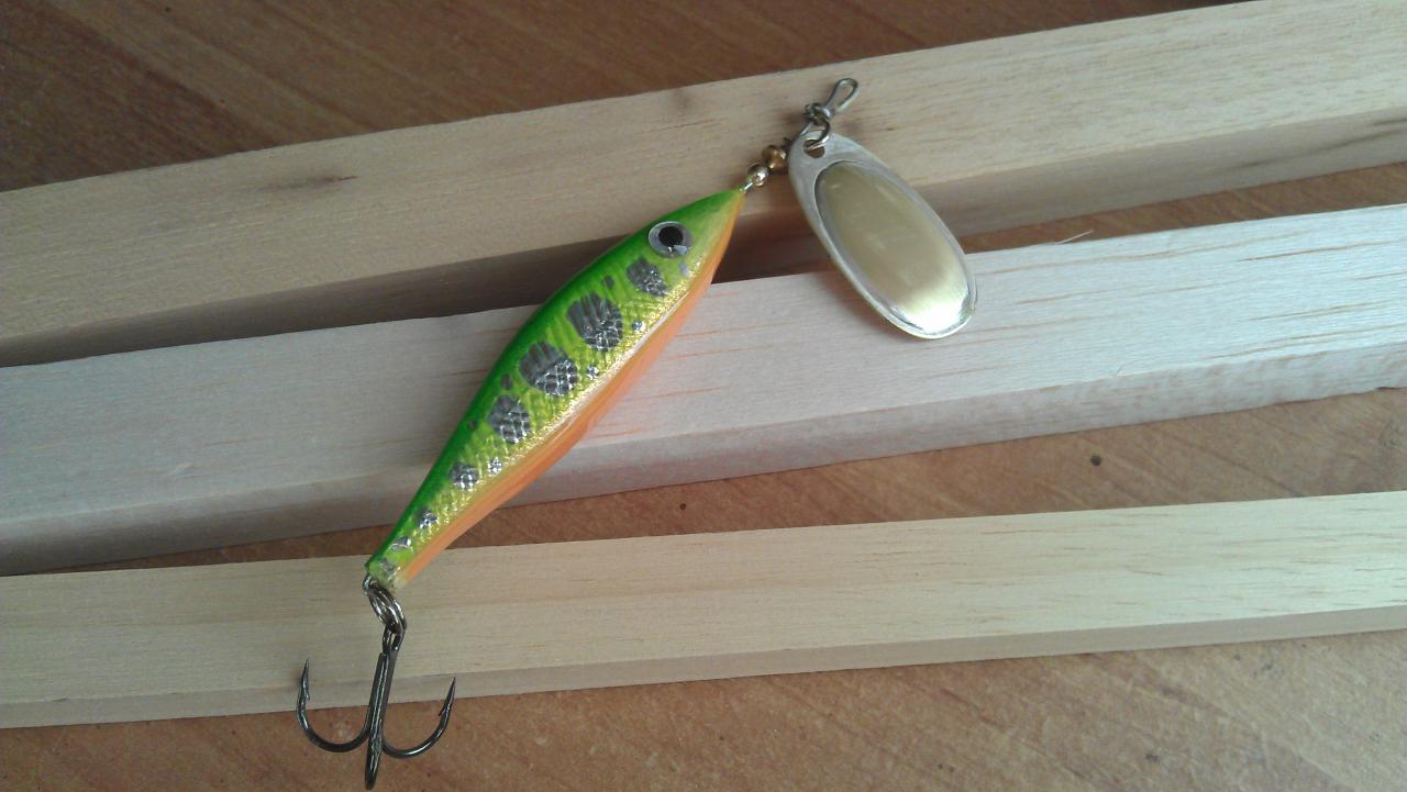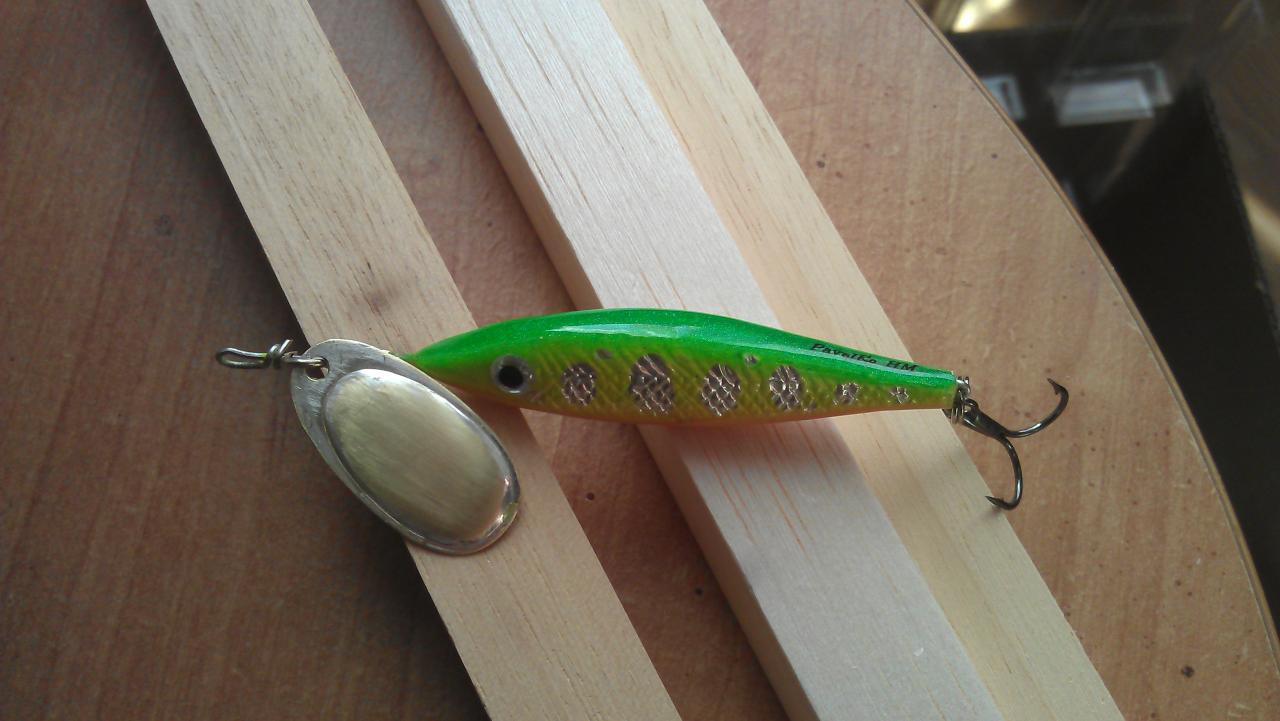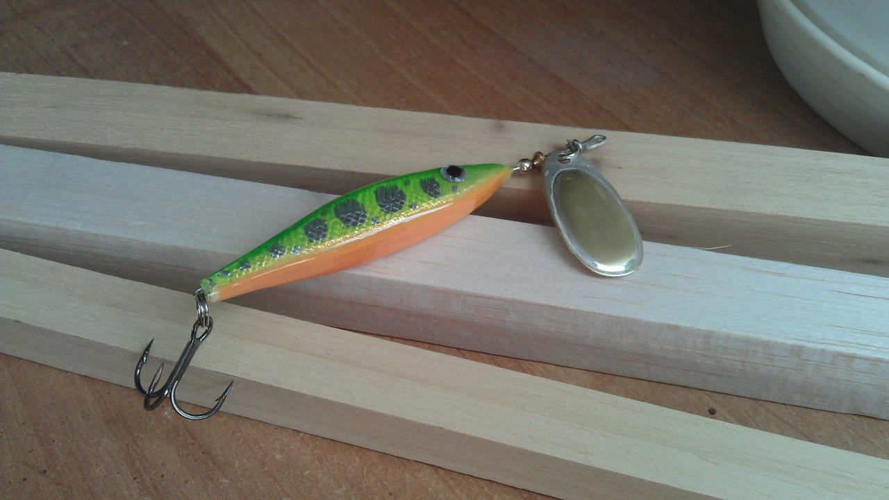 И еще сделал вот такую штукенцию, ни где у нас в магазах не мог найти такого. Бальза, 7 см, 6.2г, лепесток от блюфокса третий номер. Красил баллончиками, пропитка- пробионат, финиш- LV. Делал для жабовников, идет 3-5 см под водой, и нагоняет приятную на взгляд волну, думаю рыба должна будет оценить!
