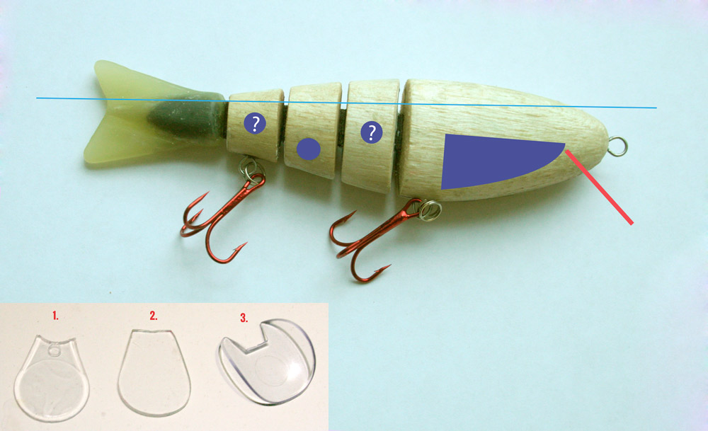 Олег, S-26мм, по песку у Варецких проверял, отдельные и ниже идут, все зависит, сам знаешь, от шнура, отпуска и др. На 5 м, как Володя говорит, наверное не загнать, проверю нынче... Если тебе кажется, что это глубоко, то на это есть причина - узкий нос воблера, лопасть вся в работе...Пара фото для наглядности...