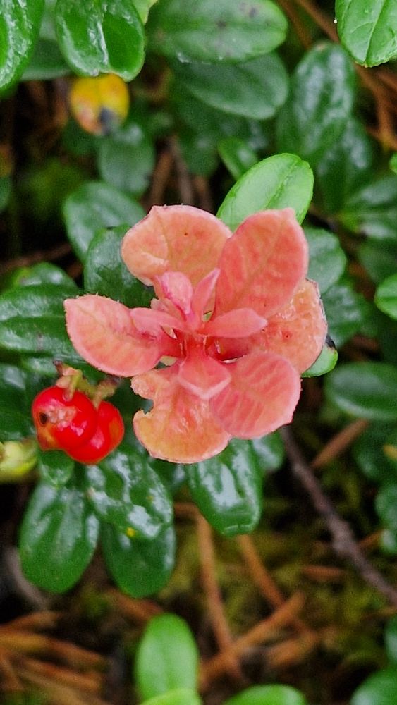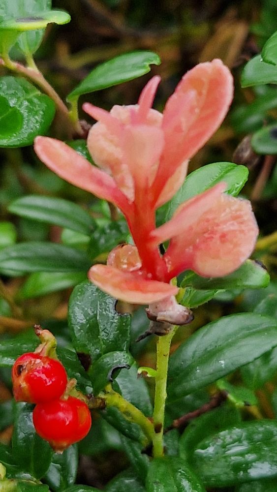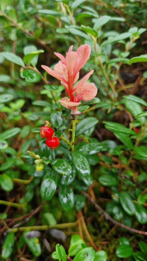 Цветущая брусника в сентябре, это удивительно, но объяснимо в зависимости от погоды. А вот что это такое сверху на на бруснике, вижу впервые и поиск по фото ни чего не дал.