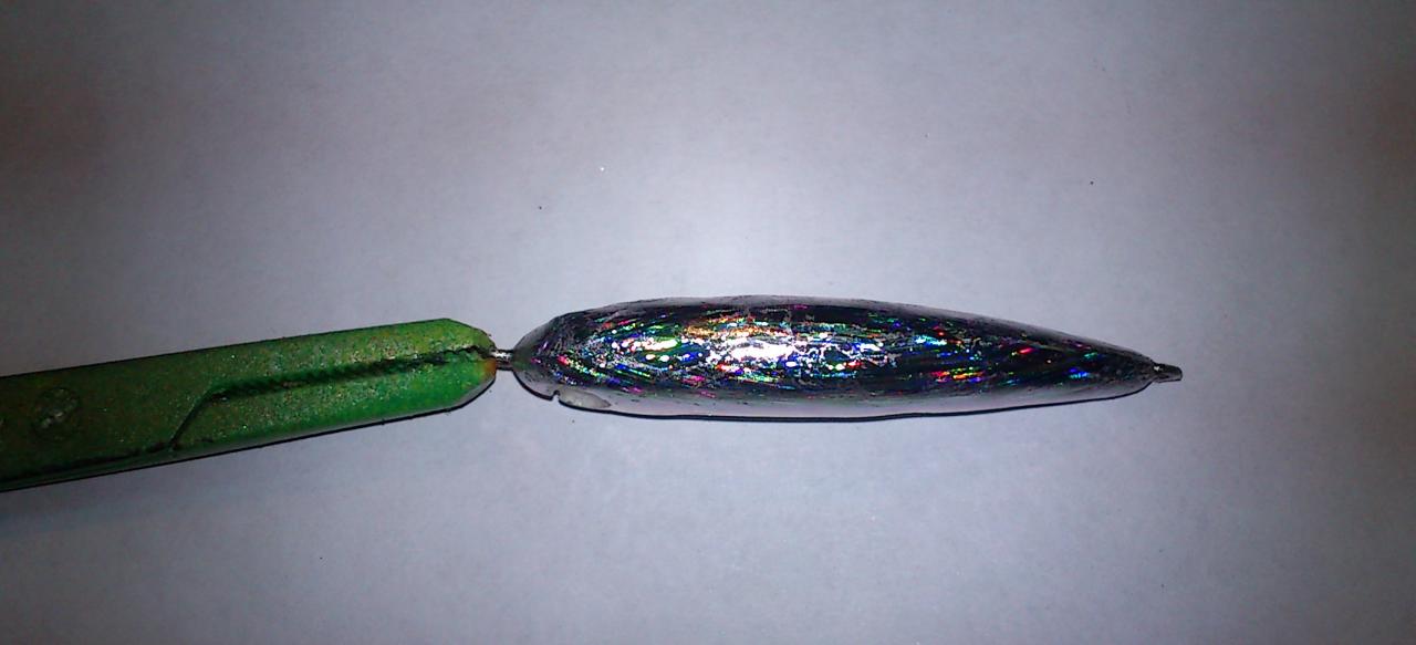 Т.к. воблерок маленький, то я кусок полоски разрезал вдоль пололам. Сверху покрою Энвиротексом, который я просто уверен, не испортит голографию, а можно и сразу на покраску а после уже Энвиротекс (как фишка ляжет).