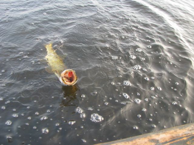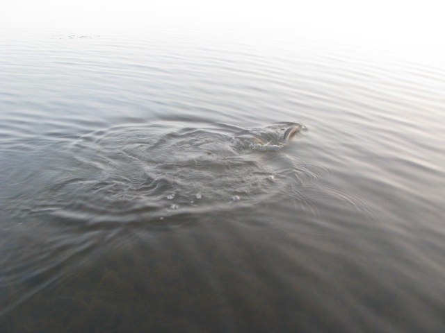 Самая необычная рыбалка сегодня у меня получилась с утра на этом озере, да и пожалуй за всю историю ловли на нем. Прибыл с темнотой, гладь да штиль, до солнца более менее поклевывало с часик, а как вылезло светило - обрубило. Рифма такая. Почапал окунька искать на полянки, а все полянки сегодня оккупировали стаи краснопера, шаряцца волнами и показалось мне что вроде как и охотяцца, бо иногда кээк вскипит стайка, потом другая, а на нерест не похоже. Пригляделся, а малька до опы . Лана, поставил самую махонькую вертуху и тут началось, от 200 до полукилограмма, не на заброс конечно, но часто били, иногда и на заброс даже, вот пожалел что камеры нет как у Кости, красотища, заброс, метр протяга, слева справа волны-зигзаги к блесенке, проводы с метр, потом кто то не выдерживает и тут вся шобла кидаецца на блесну, бах-тырсть-дерг, повисла... Стайка немного смещается, пока вываживаешь, тихонько к ней и по новой. Близко нельзя было подходить, вода кристалл, глубины от 0 до 30 см, все на пределе, а снасти на щукаса, но справлялся кое как .Так интересно было ловить что потерялся в континнуме и про--ал время работы, ну да и чорт с ней сегодня, позже может снова поеду, с наноприблудами . Сопротивляется достойно, клюеть бойко ну и конечно вся отпускается, куда её летом...
