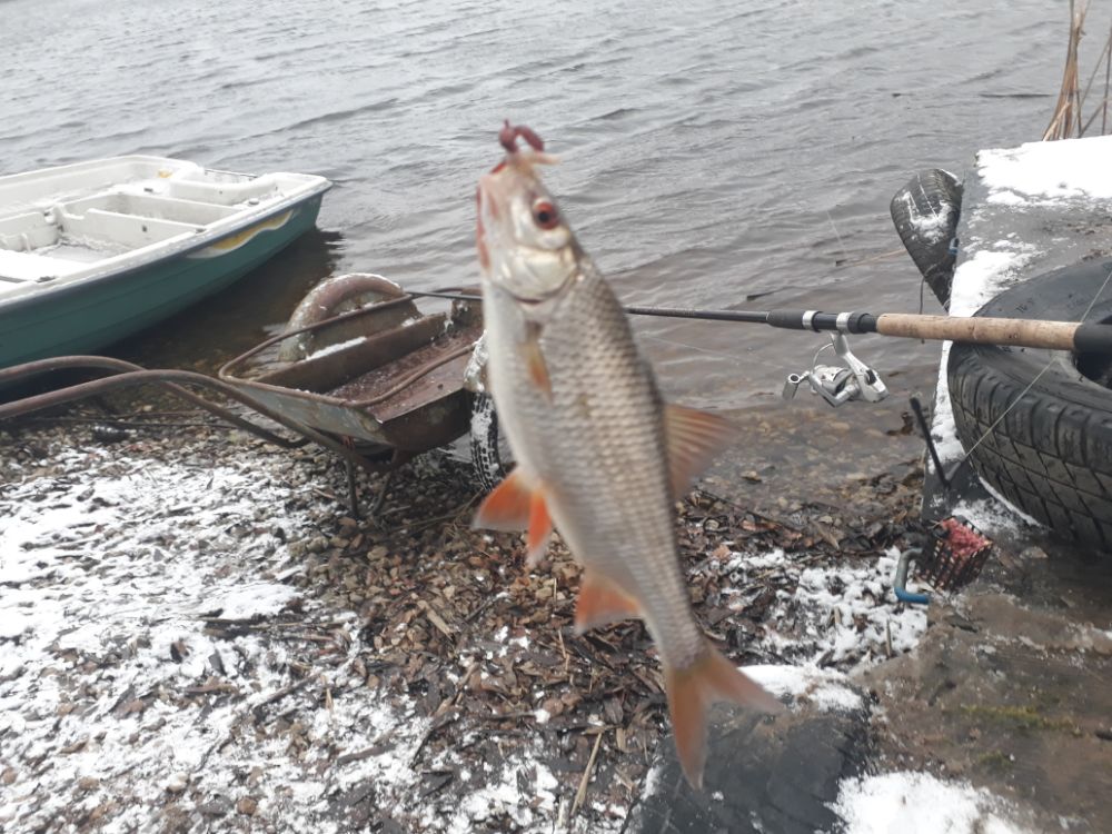 Сегодня , в озеро не выйти , ветер 10 метров , снег , вообщем ловлю с берега , рыб откликнулся сразу , иногда даже кормушка не успевает до дна дойти как уже поклевки . В улове и красноперки и подьязки и плотва . Насадка с червем , язек . Просто пару опарышей плотка. Вообщем не скучно было , правда ветренно и черви замерзали.