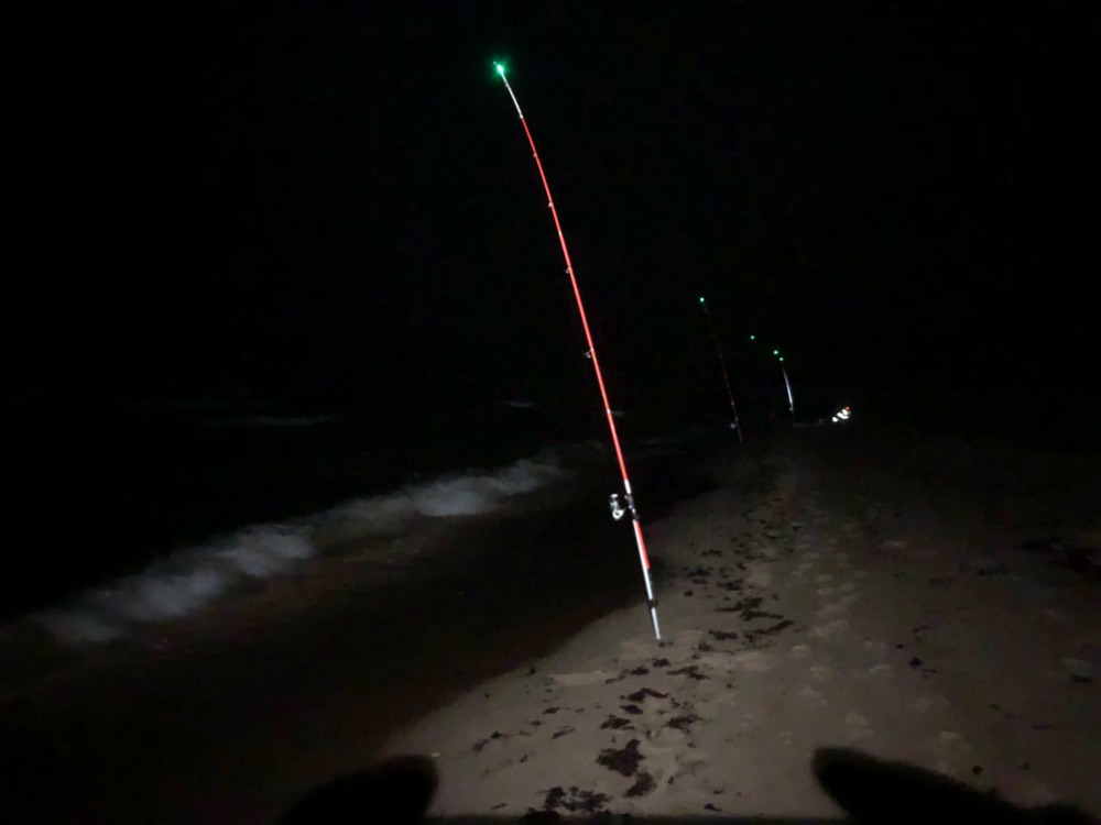 К вечеру дождь перестал, но ветер усилился. Развели мангал, приготовили ужин. К 10 часам я решил снова выйти, надеясь на вечерний выход крупняка. Но увы, пройдя почти весь пляж в ведро удалось положить лишь 2 стоящих хвоста, да и те не были гигантами по местным меркам. К полуночи лов закончил.