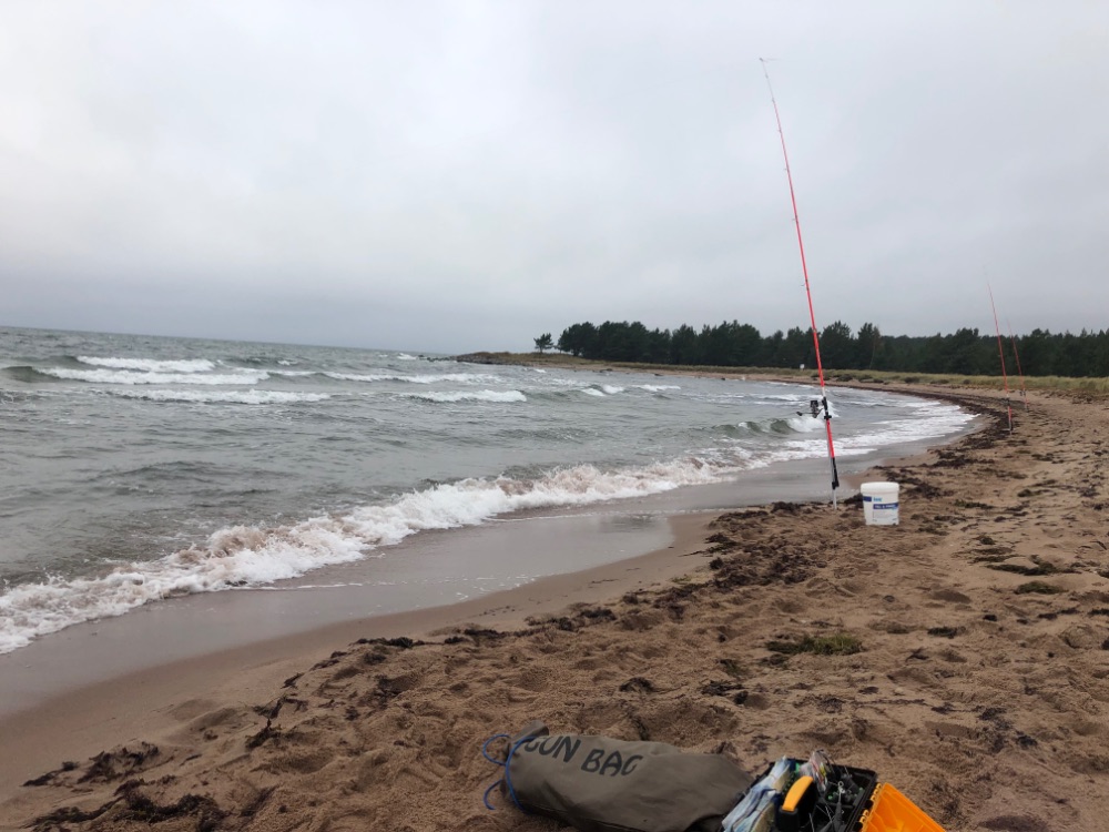 К вечеру дождь перестал, но ветер усилился. Развели мангал, приготовили ужин. К 10 часам я решил снова выйти, надеясь на вечерний выход крупняка. Но увы, пройдя почти весь пляж в ведро удалось положить лишь 2 стоящих хвоста, да и те не были гигантами по местным меркам. К полуночи лов закончил.