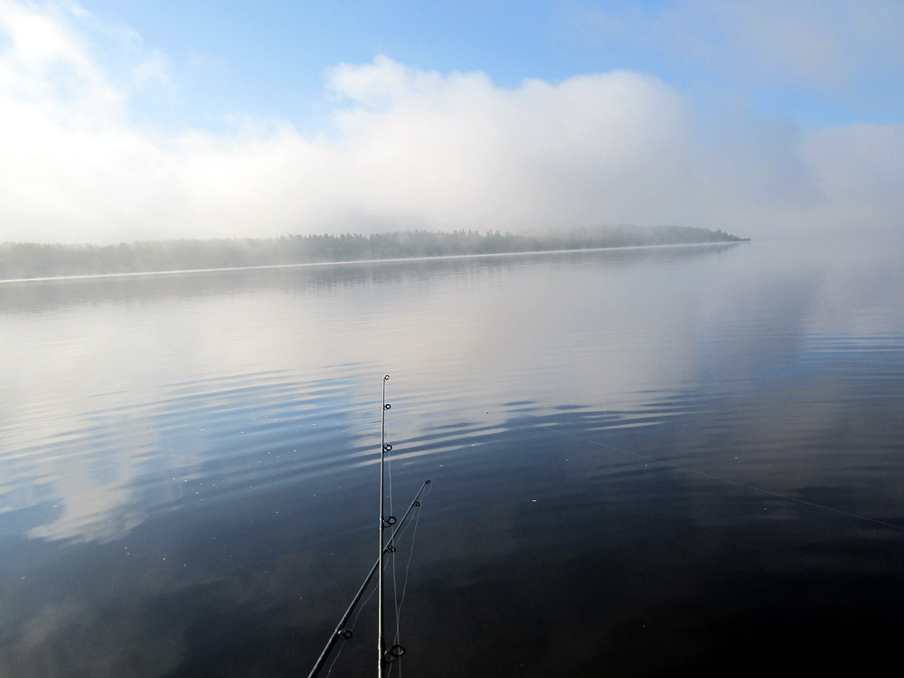 В связи с не благоприятной погодой в море я сегодня не пошёл и решил скататься на утреннюю зорьку да проведать щучек на одном мелком озерце. По приезду на воде был большёй туман. Хоть ветра и не было, но даже в зимней куртке и спасжилете было не очень комфортно, спас горячий чай из термоса.