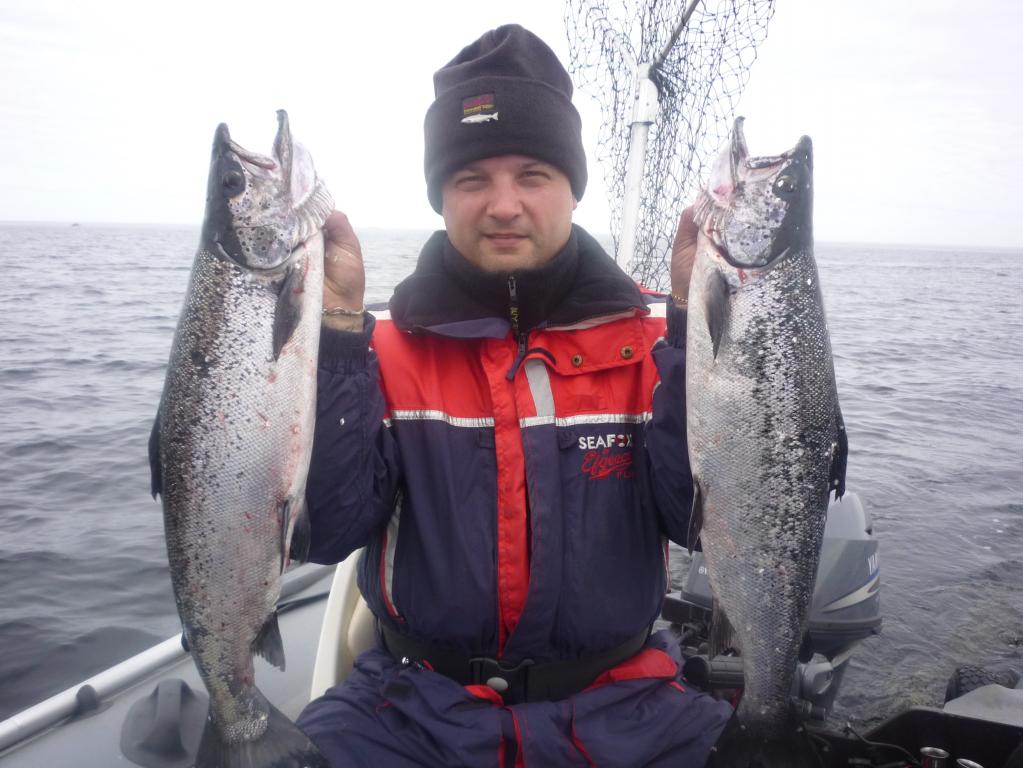 Сладкая парочка собрала в кучу оставшиеся спиннинги,сначала был подсачен один с гирляндой из четырех воблеров на голове,был вынут, воблеры отрезаны от лесок и оставлены в подсаке,второй подсачивался подсаком в котором они так и остались.Потом был секас по выпутыванию лосося и воблеров и подсака.Но результат того стоил...