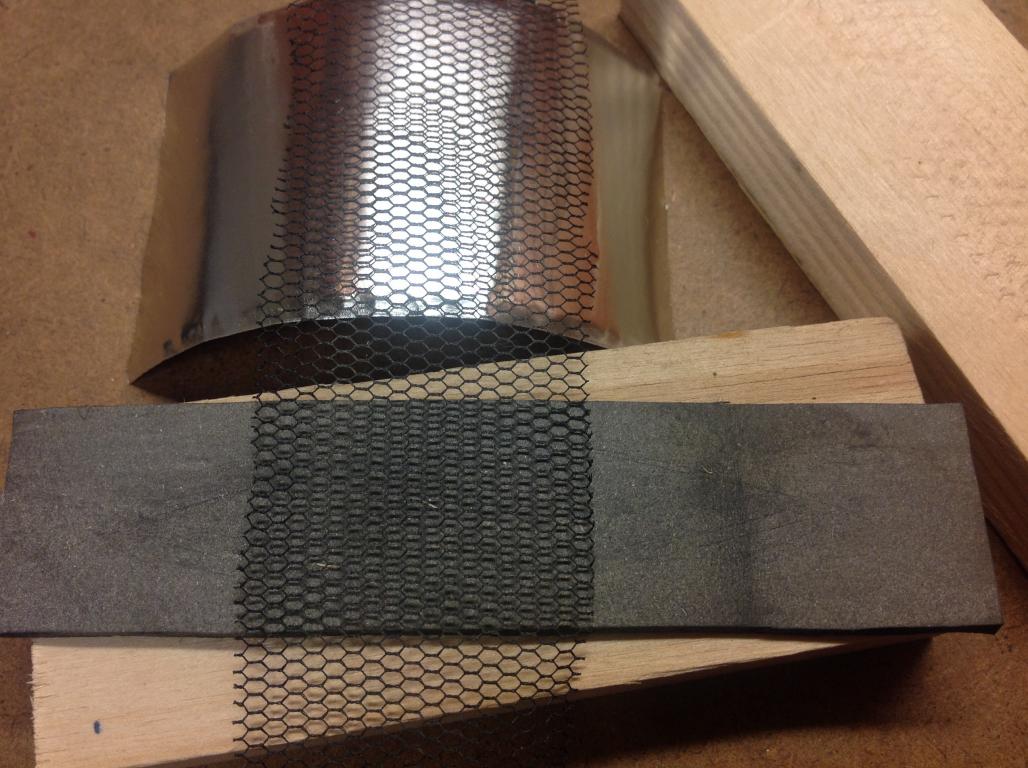 Зажимаю в тисках бутерброд : металлическая пластина, резина 2-3 мм, фольга, сеточка (через которую наношу чешую аэром), металлическая пластина.