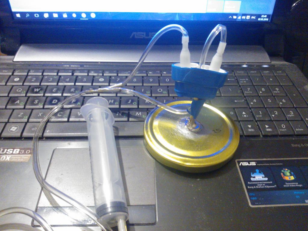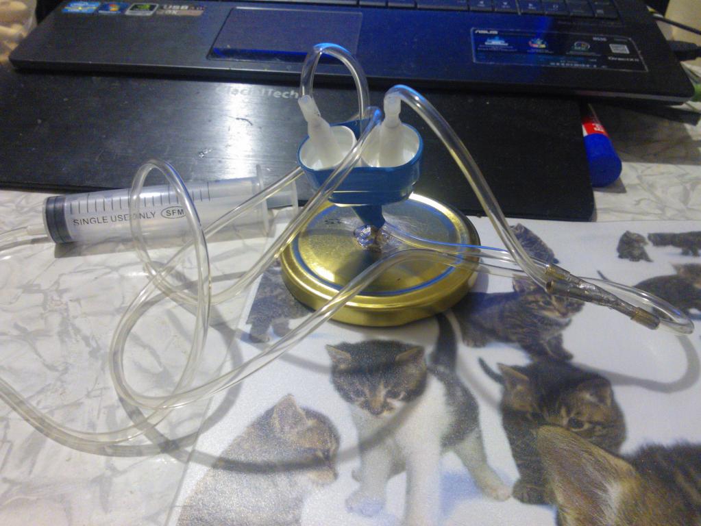 К вопросу о "вакуумке". Сегодня собрал из подручных средств. Остались пузырьки от "ринонорма", а у них пшикалка с канюлей. Вертел в руках, думал куда приспособить. оказалось на них система-ниппель. Трубки - один в один натягивается капельница. Спаял тройник и патрубок в крышку банки. И всё.