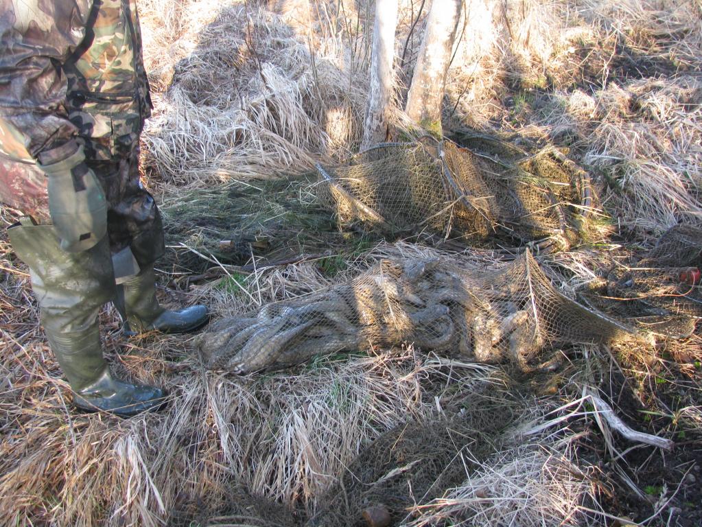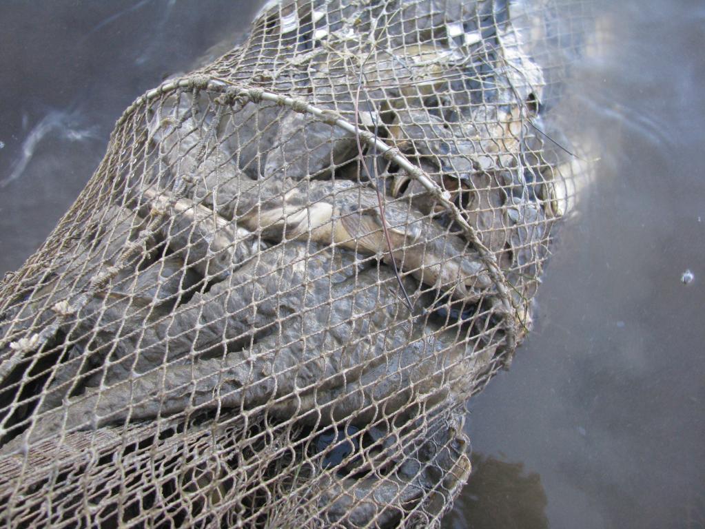 Не знаю как эта снасть называется. В стороны отходят сетки а в середине несколько конусообразных морд. Одна морда была полная рыбой. В основном налим. Рыба вся протухшая и покрыта илом. Скорее всего с прошлой осени осталась. За два захода выволокли всё на берег.