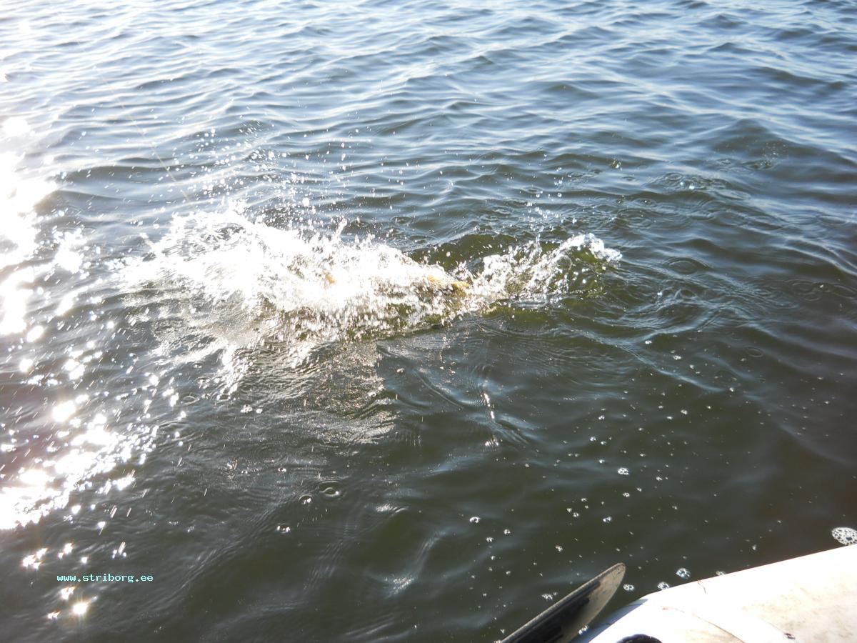 Дальше на одном участке делают ремонт дороги. Одна полоса движения срыта, стоит светофор и пропускает машины в обоих направлениях. По обе стороны дороги глубокие канавы. Прямо по полосе идет взрослая лосиха и ищет место, где бы можно было спуститься с дороги. Метров пятьдесят двигаемся на почтительном расстоянии за ней. Наконец она уходит и путь свободен. Вышли с рассветом и при полном штиле и ярком солнце и низкой воде можно было сразу паковать вещи..... За пару часов ни выхода, ни удара. Прошли почти половину залива и только одну щуку спугнули лодкой. Решили что-то менять. Лодку на машину и переезд в Пярну. Уже на подъезде видим, что разошлась волна и приличная. Выходим в море. Сразу на выходе видим волны с барашками, лодки местных возвращаются на берег. Все-таки пробуем. Ходить можно. Имею один загиб, но на полпути сход ваучера. Дальше четыре километра по гребням волн не приносят вообще ничего и решили уйти в реку.